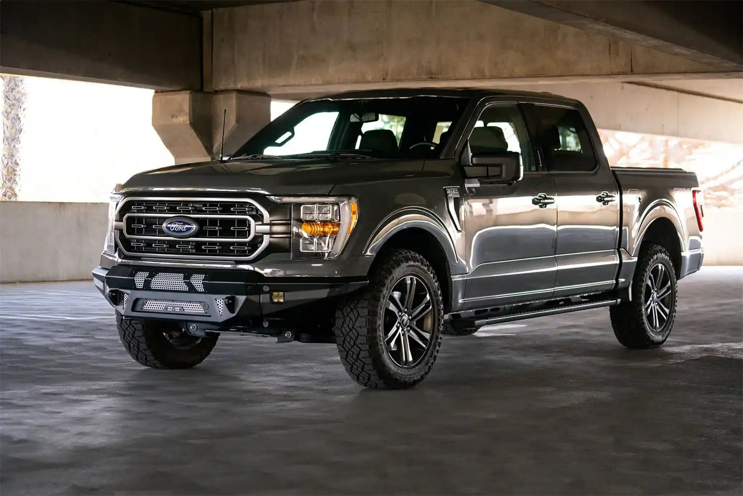 The MTO Series (Made to Overland) Front Bumper is a low-profile bumper for the 2021+ F-150. There are two mounting points for 3/4-inch D-ring shackles to provide recovery options. Sensor hole mounts accommodate the factory parking sensors and plugs are provided for non-sensor models.?At each side of the bumper are mounting points for 3-inch pod lights. The optional MTO Series Universal Bull Bar can be installed on top of the bumper, which mounts a 13-inch single row LED light bar. If your F-150 is equipped with Adaptive Cruise Control, it will need to be relocated in order to retain adaptive cruise functionality