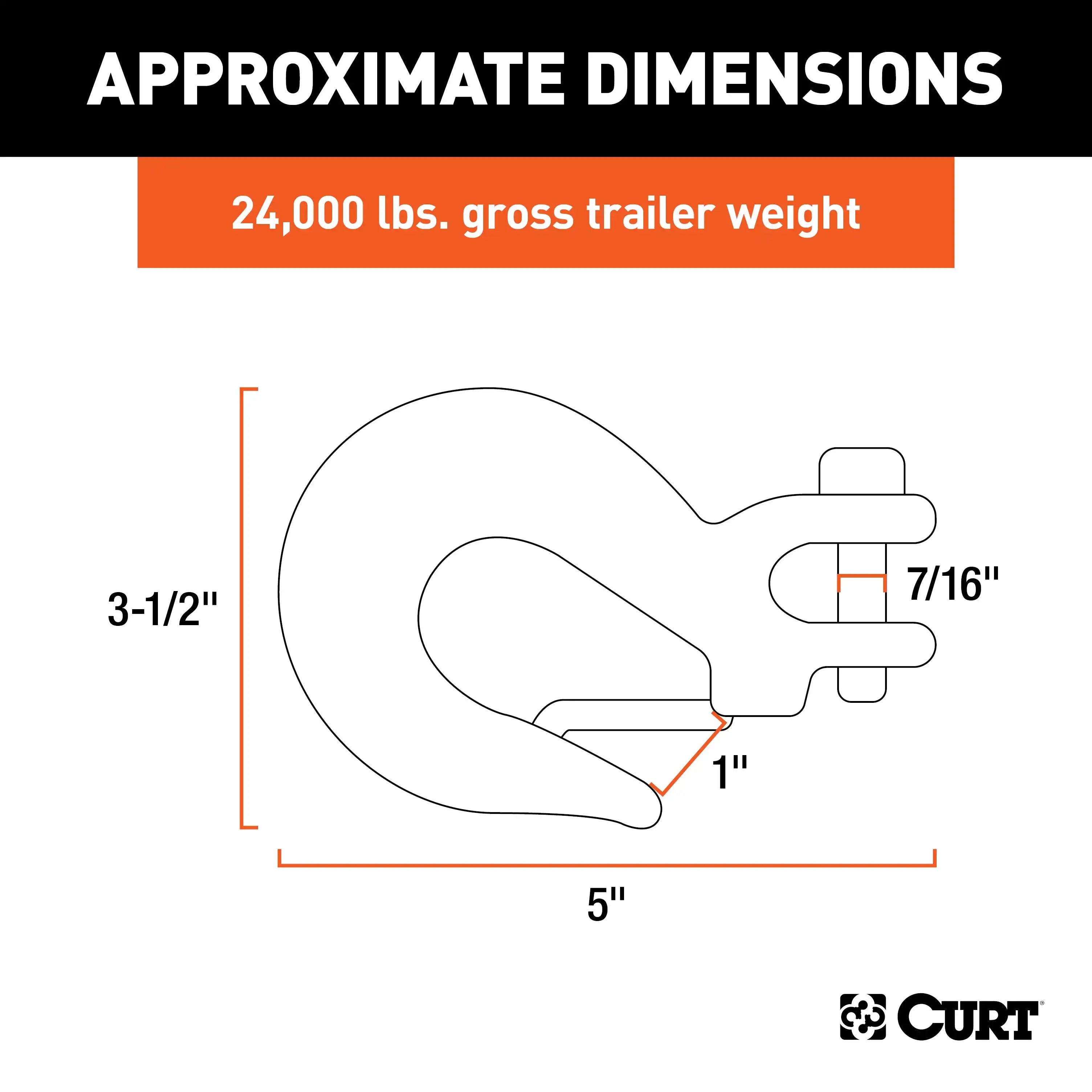 There are always some factors on the road you cannot control -- an irresponsible driver, adverse weather conditions -- but one thing you can control is the type of towing equipment you use. Just because there are threats out there, doesn't mean your towing adventures need to be dangerous. CURT offers a variety of towing safety products -- including safety chains, safety cables, hooks, links and more -- to make sure you have confidence to Bring It and trustworthy equipment to Bring It safely. CURT clevis hooks are heavy-duty hooks for connecting safety chains or transport binder chain. Meeting the requirements for high-test, transport and alloy chain, clevis hooks are perfect for latching down heavy cargo and securing large loads in commercial and industrial applications. They feature a forged, heat-treated steel construction to ensure long-lasting wear resistance, and they come with a durable zinc finish to outlast the elements. This particular clevis hook has a hook size of 1" and offers a gross trailer weight capacity of 24,000 lbs. It comes with a hook pin and cotter pin for solid attachment to a chain link or cable loop, and it also features a spring-loaded safety latch. Similar to a quick link, the safety latch allows for a safety chain connection that won't come loose from vehicle vibrations or jarring on uneven terrain. Remember, when attaching safety chains, the chains should be cross underneath the trailer coupler, and each hook and chain must be rated to meet or exceed the gross weight of the trailer.