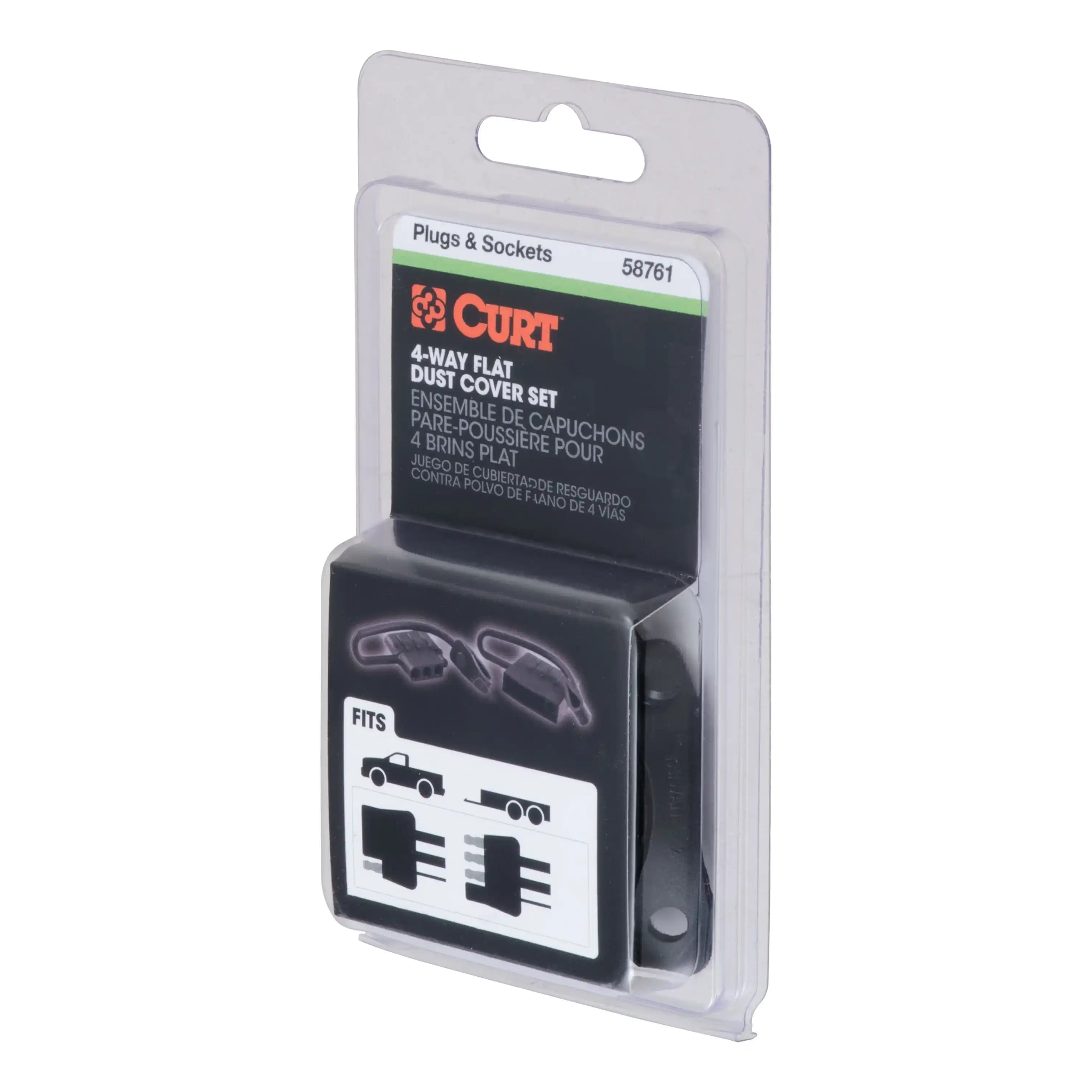 Like trailer hitches and ball mounts, electrical connectors range all over the board in shape, size and capability, but no matter what your trailer's electrical functions are, you need a solid connection to keep the power flowing and ensure safety on the road. CURT electrical connectors are designed and manufactured to give you a reliable connection every time you plug in your trailer. Protect your vehicle-to-trailer wiring connection with CURT electrical plug and socket covers. This set of 4-way flat dust covers features durable black rubber construction to easily resist the elements and maintain good connectivity. The covers come with convenient attachment tabs to avoid loss, and the kit includes both a vehicle-side socket cover and trailer-side plug cover.