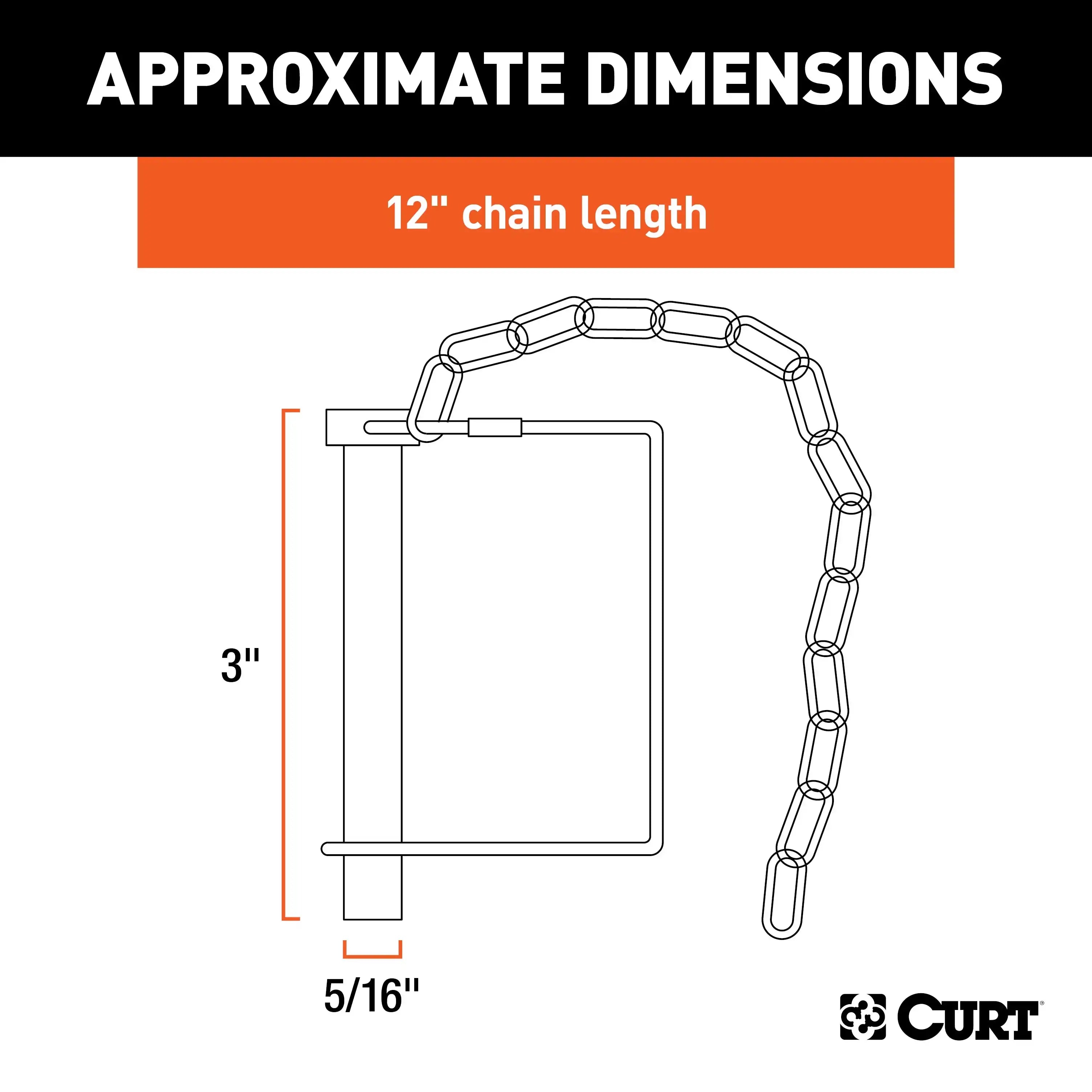 CURT safety pins go beyond the simple function of keeping your coupler latch secure. They are constructed from quality materials and have a universal design that allows them be used for a variety of purposes in your towing setup. CURT safety pins are made from solid steel to provide more than enough strength to keep your trailer coupler latched down tight. The zinc plating that we use to finish our safety pins offers excellent protection against rust and corrosion. This is necessary for any trailer because of its frequent exposure to the elements. The user-friendly design of our safety pins allows them to be easily handled while maintaining effective security. This safety pin has a pin diameter of 5/16" and includes a 12" chain attachment to mount onto your trailer coupler and prevent the safety pin from being misplaced. Use CURT safety pins for securing trailer couplers, jacks, caster wheels and more. When you couple your trailer to your vehicle, nuts and bolts just do not cut it. Secure your towing equipment right with a safety pin from CURT.