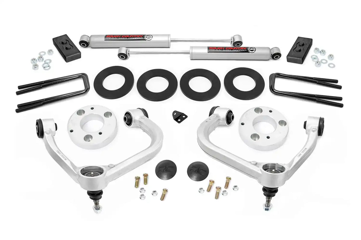 Rough Countrys 3in Bolt-On Kit offers easy installation and aggressive good looks at an incredible value. Take your truck to new heights with this excellent option for F-150 pickups. This kit features a set of high-quality, Forged 6082-6 Aluminum Upper Control Arms designed to make alignment adjustments easier and Clevite rubber bushings for enhanced durability. These arms are designed to promote a factory-like geometry by keeping the ball joint at optimum angles after lifting. This design allows for an improved, greater range of motion from the ball-joint, with less stress, wear and tear. Also included are a set of rear blocks to provide lift height in the rear. Once installed, this kit gives your truck plenty of ride height for up to 34in tires while offering a clean, level look from front to rear. Retain your stock wheels with this kit when you use Rough Countrys 0.25- in. wheel spacer. This all-inclusive kit comes with everything you need, and installation is a piece of cake compared to other kits on the market! Featuring a 100% bolt-on installation process that requires zero cutting or drilling, this kit can be installed using common tools in a home garage and allows the truck to be returned to stock at any time if so desired. Best of all this kit features Rough Countrys Lifetime Replacement Warranty.