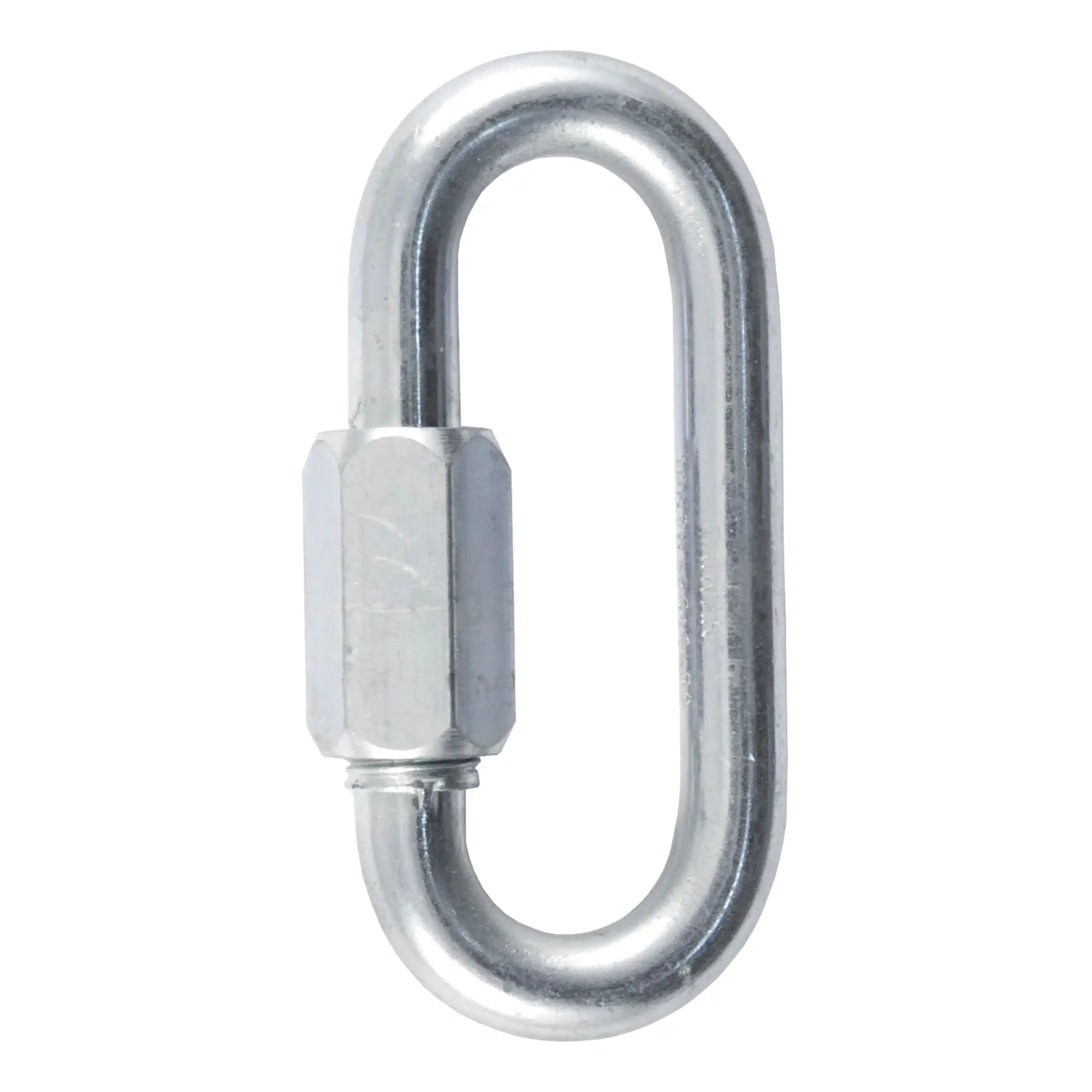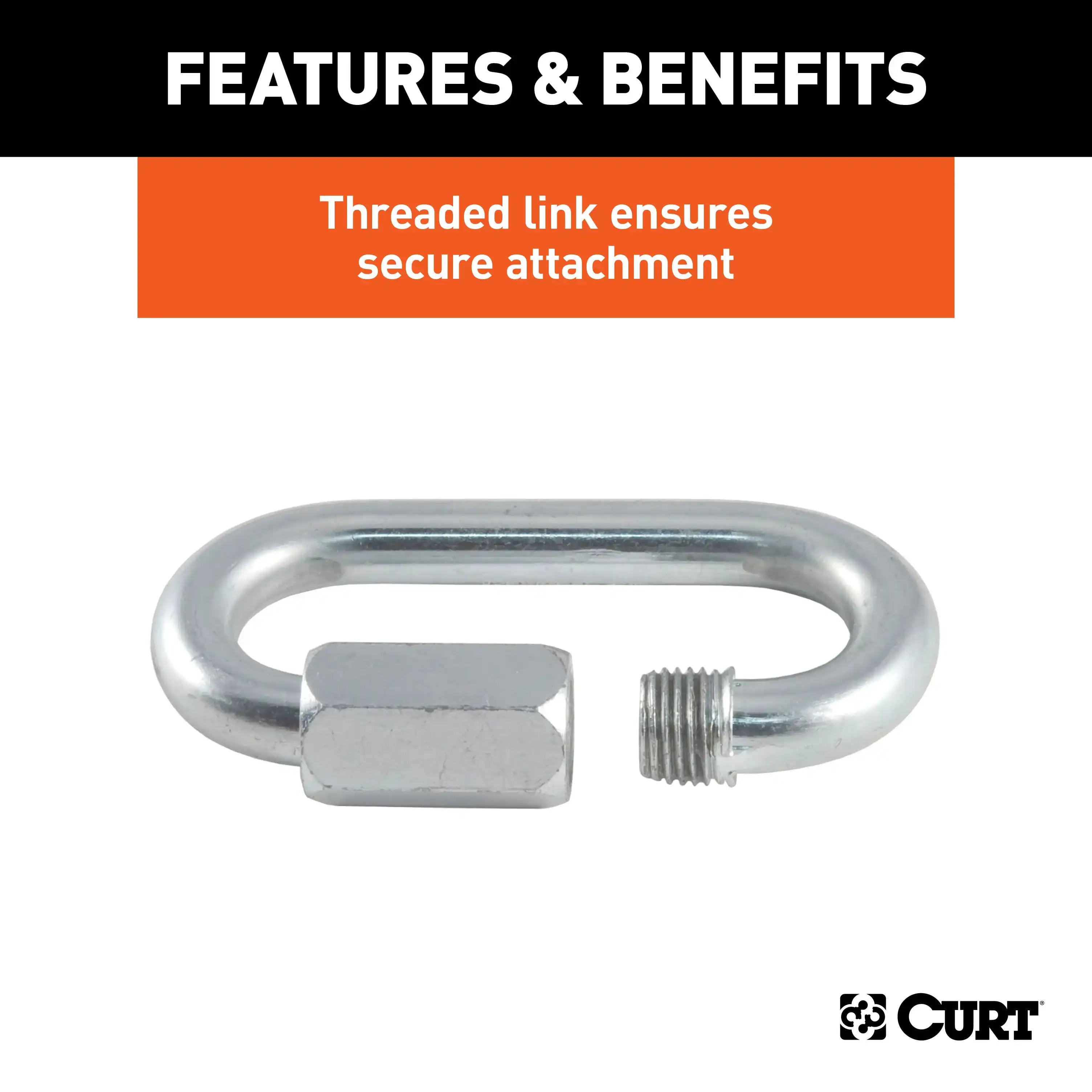 CURT quick links are an extremely versatile and reliable tool to help you get to your destination and go a little further once you get there. A quick link is essentially a hook that is able to be fastened into a closed loop. This means it can be linked onto any D-ring or tie-down like a hook and just as easily secured like a seamless link in a chain. CURT quick links feature a special threaded end and barrel screw that allow them to be dependable and convenient. The threaded link requires no tools for tightening or loosening, though it does feature a hex shape that can accept a wrench for an extra tight hold. Quick link hooks can be used to connect rope, cable and chain, and they are the perfect safety accessory to maximize the security of your safety chains and trailer. Their list of possible applications also goes well beyond towing, giving you a reliable connection for rock climbing, boating, camping, setting up a swing or hammock, leashing the dog, repairing chain, fastening down cargo and more. To make sure our quick links are fit to face the outdoors and all of your undertakings, we construct them from heat-treated steel and give them a zinc-plated finish for durability and rust resistance. This CURT quick link features a breaking strength of 13,200 lbs., a working load limit of 2,640 lbs. and features a 7/16" diameter link.