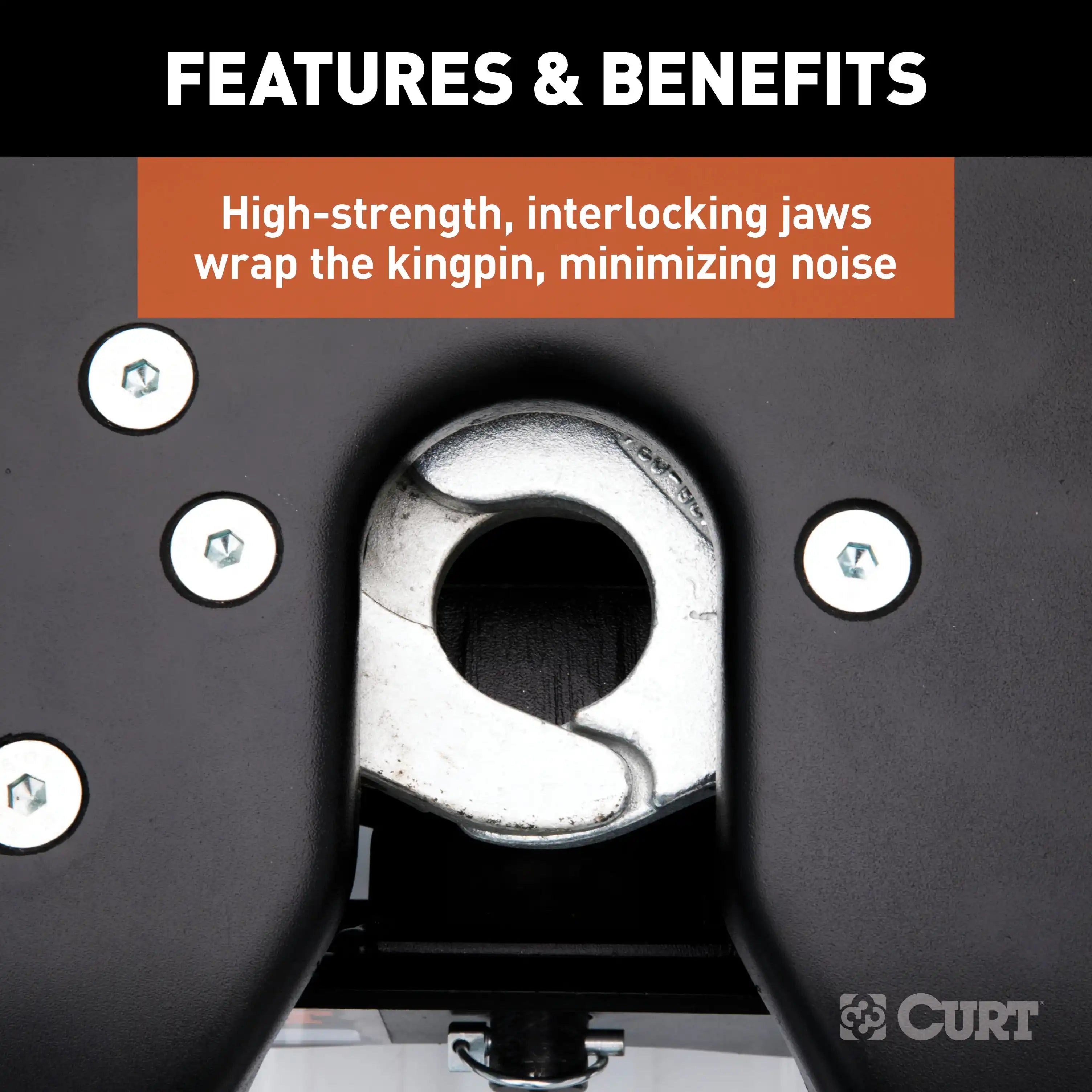 The CURT A20 5th wheel hitch offers smoother, quieter towing for your home-away-from-home, combining the patented technology of our A-series, an easier mounting system and the power of a 20K 5th wheel hitch. Like our A16 hitch, this 20K 5th wheel hitch uses a patented cast yoke to allow for unimpeded head movement, while providing exceptional stability for the trailer. The yoke has a set of poly-torsion inserts to suppress shock loads and reduce excessive noise, and the head features high-strength, interlocking jaws to give the trailer stability and the freedom to pivot and swivel as needed. This A20 5th wheel hitch also comes with a set of CURT OEM puck system 5th wheel legs designed to be mounted on select Chevrolet or GMC long-bed pickup trucks with the truck bed puck system (year range specific). The legs mount directly into the four-point mounting system, allowing the CURT A20 hitch to be installed quickly and easily. The most unique feature of these legs is their quarter-turn anchoring system. The variable-position anchors allow the 5th wheel hitch head to easily drop into the puck system, and with a quarter-turn, the hitch can be installed or removed as needed. The anchors can also be adjusted to eliminate any chucking noises. Once installed, the A20 is fast and simple to operate. It has a lockable, single-throw handle that self-resets to the ready-to-couple position after uncoupling, and it is equipped with a coupling indicator that is visible from the truck cab. To protect the A20 5th wheel hitch against rust and wear, it comes with a black carbide powder coat finish and a limited lifetime warranty. We also test the A20 for safety in accordance with SAE J2638 to ensure reliability for the road ahead.