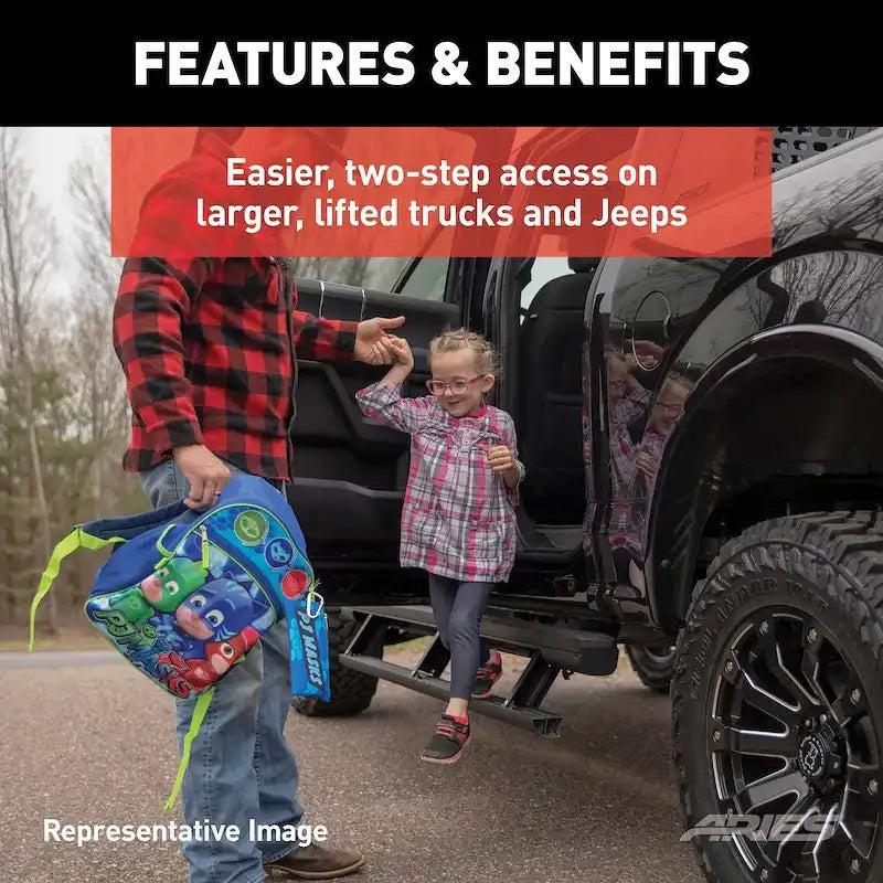 ARIES ActionTrac powered running boards are unique from other power side steps because they are actually two steps in one. This patented step-within-a-step technology -- combined with a no-drill bracket installation, control module operation and powder-coated aluminum construction -- truly makes these retractable running boards an asset for the offroad truck or Jeep, particularly as lifted truck steps. ActionTrac motorized running boards have one 4" wide step on top of the main housing and one 3" wide that automatically deploys as needed. When the door opens, the control module deploys the power step 8" below the main step, 15" below the doorsill, depending on the model. This two-step design offers enhanced safety and easier vehicle entry and exit, especially on large, lifted vehicles. It's also very helpful for families with young children and for elderly passengers. The boards contour to the vehicle and offer extra protection for the rocker panels from small road debris. For additional safety, the module is able to detect any obstructions during operation to avoid pinch hazards. LED lights are also built into the housing to illuminate the steps when deployed. ARIES ActionTrac automatic running boards are made for vehicle-specific installation for a custom fit. They use pre-existing factory holes for the brackets to eliminate drilling. They also do not require any splicing into original factory wiring. These particular automotive running boards fit specific years of the Chevrolet Silverado and GMC Sierra 1500, 2500 HD or 3500 HD crew cab (see application info to verify fitment). Each set is constructed from powder-coated aluminum to be strong, lightweight and non-corrosive. The quiet, maintenance-free rotary motor is shielded within the main housing, along with the powerboard pivot points and all electrical components, protecting them from the harsh elements. NOTE: Boards, brackets and wiring are included.
