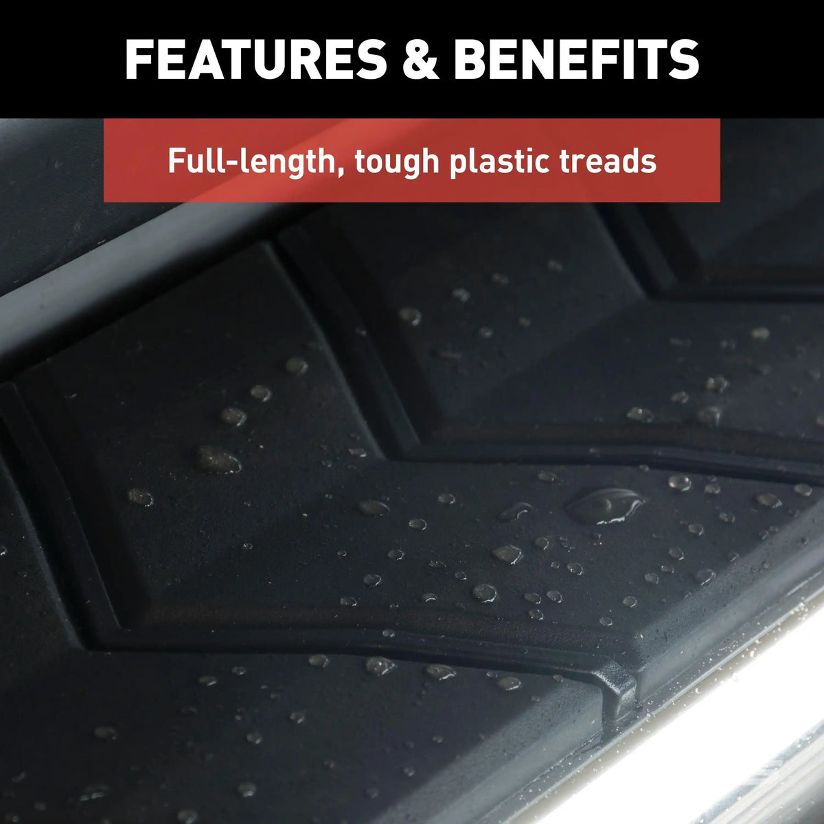 For some, it's more than just a drive. It's about definition -- finding the rush that comes with your hands on the wheel and your foot on the gas -- and it starts by stepping into your vehicle with confidence. ARIES AeroTread running boards give new definition to your drive with their sleek design, full-length treads and flawless finish. They feature unencumbered aluminum construction and a custom contour to redefine your look and offer a solid step up. Made specifically for today's crossover and SUV, ARIES AeroTread running boards are marked for their aerodynamic look and lightweight build. They are constructed from an extruded aluminum base, making them strong and impervious to the elements. Each set of running boards features sleek, curved edges with tapered ends to seamlessly blend with the body of your vehicle. To give you the exact, customized look you want, AeroTread running boards come with one of two front-trim finish options: polished stainless steel or black carbide powder-coated stainless steel. They are also equipped with a 5" wide, hard plastic step pad that runs the entire length of the board, providing a non-skid surface no matter where you place your foot. AeroTread running boards install using a track mounting system to attach vehicle-specific brackets, and pre-existing holes in the vehicle's frame are used to speed up installation and ensure stable footing. This set of running boards is designed to fit specific years of the Nissan Rogue (see application information to verify compatibility with your vehicle). The mounting brackets are made from steel and are coated in a powder coat finish for long-lasting dependability. Whatever road you choose, define your drive with ARIES AeroTread running boards.
