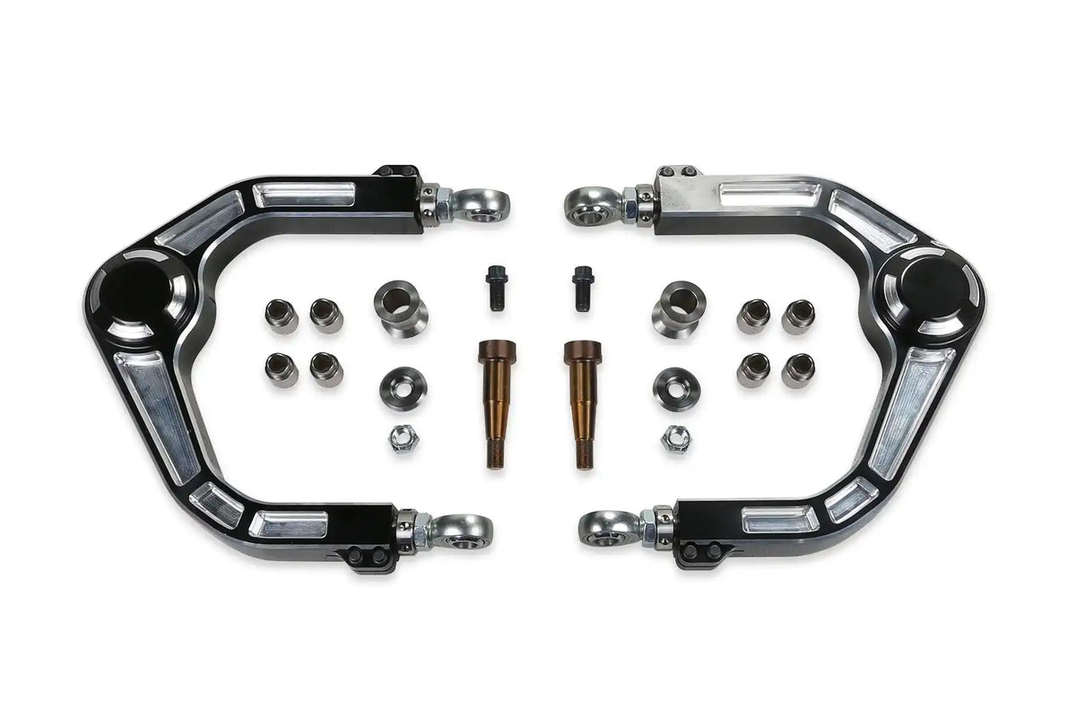 2010-14 Ford F150 Raptor 4WD - Fits 0-4in Lifts. Fabtech's high quality Billet Upper Control Arms are the ultimate upgrade for increased suspension strength and aggressive offroad use. Built of 6061 aluminum with thick cross sections, they will reduce suspension flex and provide a more positive road feel. These UCA's feature large PTFE lined 1.250in ID Stainless Steel Uniball bearings and 17-4 Stainless Steel pins that are designed to handle rugged offroad driving. The Uniballs allow for 10.5in increased wheel travel when paired with Dirt Logic Coilover shocks. The heat treated Stainless Steel Uniball pin is tapered to fit into the stock BJ taper for an easy return to stock feature. On the frame side of the Arms high quality FK 3/4in heim ends are used to eliminate control arm deflection. These FK 3/4in heims create a solid mounting point to the frame for the UCA with unsurpassed longevity. Stainless steel threaded adjusters on the arms allows the heims to be adjusted on the vehicle to dial in the front suspension alignment. The stunning black anodized finish with flawless machine work will make these Billet UCA's the crown jewel of your vehicle's suspension. Features: Allows for 10.5in travel with Dirt Logic Coilovers. 6061 Billet Aluminum with thick cross sections for strength. PTFE lined 1.250in Stainless Steel FK Uniballs for severe offroad use. Heat Treated 17-4 Stainless Steel Uniball Pins fit into stock BJ taper. 3/4in Stainless Steel FK Heim Ends with threaded adjusters. Billet Uniball cap keeps dirt and debris out. Compatible with Fox Live Valve shocks. Arms are adjustable to provide increase front end align ability. Stunning black anodizing with flawless machine work. Uniball Upper Control Arms.