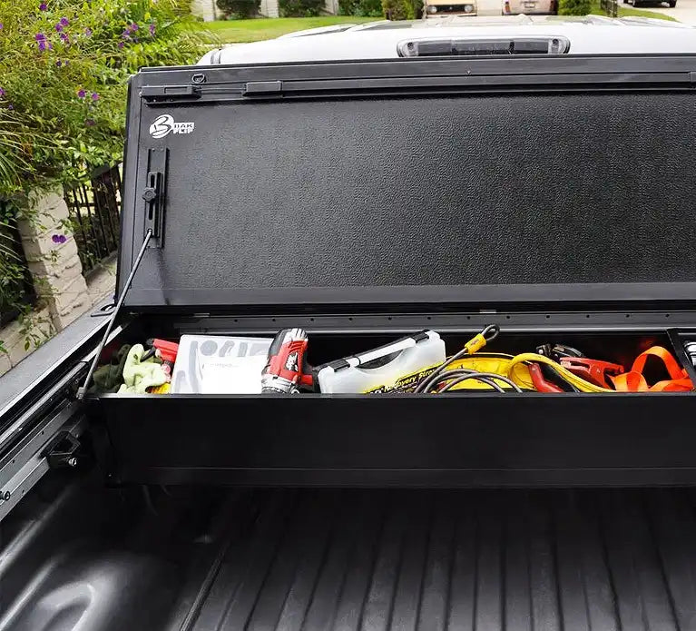 The BAKBox2 is a TOOLBOX1 for the back of your truck that is designed to integrate with a BAK truck bed cover. Unlike a regular TOOLBOX1, the BAKBox2 has a wealth of design innovation built into it that sets it apart from any other TOOLBOX1 The BAKBox2 can conveniently fold away when not in use, giving you full bed access when need to haul large loads. It s made from solid FRP composite panels, making more impact resistant than an Aluminum TOOLBOX1. Like all BAKFlip truck bed covers, the BAKBox2 lays completely flush, and doesn't stick out above the rails of your truck, providing a clean, stylish look. Installs quickly, and is guaranteed to last as long as your truck does.