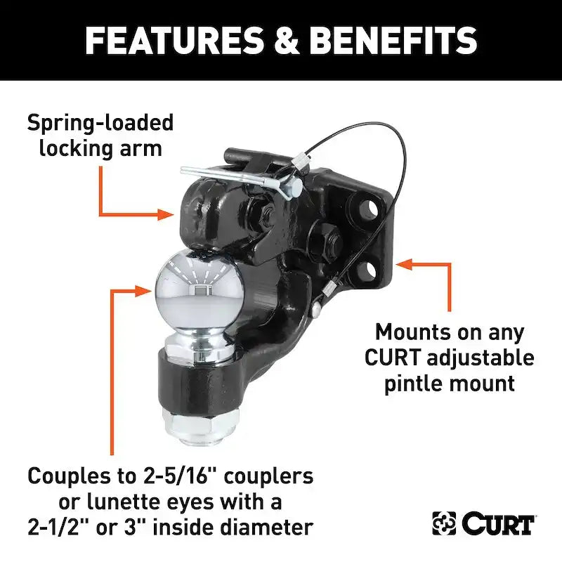 In agriculture, construction and even military applications, pintle hitches are the trusted product of specialized towing. They are notorious for their high weight capacity and simple design. The basic pintle hitch is essentially a hook and loop, with the hook attached to the vehicle and the loop mounted on the trailer. Because of their simple design, pintle hitches are able to have thicker metal construction and more secure coupling. CURT combination ball and pintle hitches combine both a pintle hook and a standard trailer ball to give you a more complete towing option on your heavy-duty truck or SUV. Combination ball and pintle mounts are available with a shank to mount on a receiver or in the adjustable style to mount on a channel or plate. This particular CURT combination pintle and ball mounts features a ball capacity of 16,000 lbs. and a pintle capacity of 16,000 lbs. (NOTE: Never exceed the lowest weight capacity of any towing component; i.e. the vehicle, hitch, trailer, etc). It fits any lunette ring with a 2-1/2" inside eye diameter and features a changeable 2-5/16" trailer ball with a hard chrome finish. A safety pin and bolt kit are also included in this package. The heavyweight towing done with pintle hitches implies a certain amount of wear and tear on your towing equipment, and to prepare for this, CURT uses a quality finish on all our pintle mounts, lunette eyes and combination pintle hitches. This combination ball/pintle hook is coated in a gloss black powder coat finish to provide the perfect amount of rust and scratch resistance needed to face the heavy-duty towing you do every day.