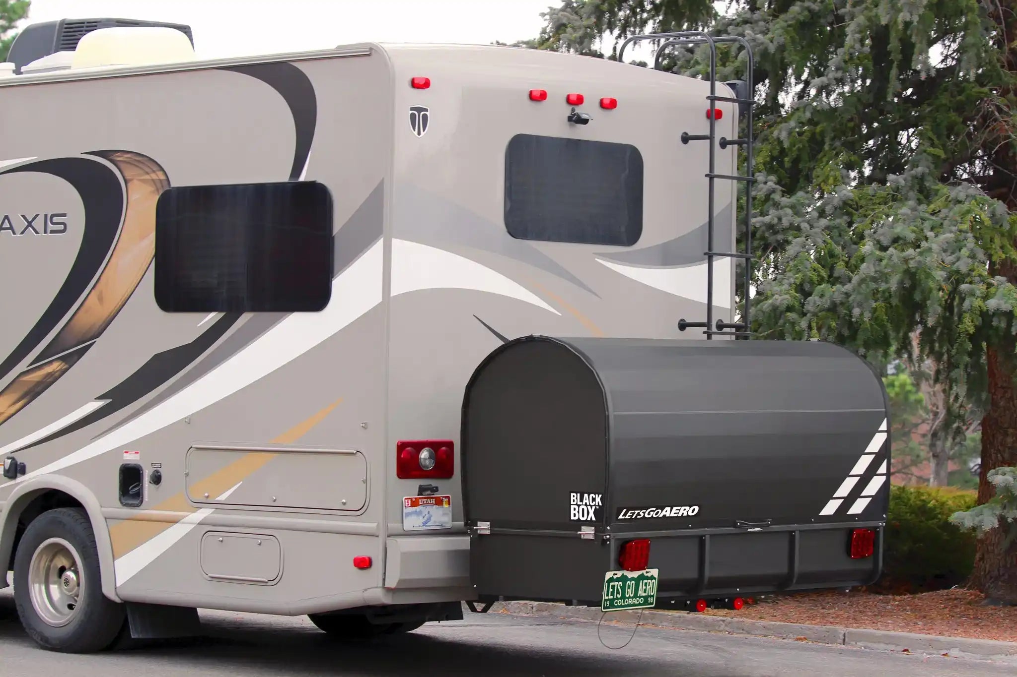 Super-sized BlackBox ™ cargo carrier offers an additional 64 cubic feet of storage space for up to four bicycles, tons of luggage for group travel, large mobility wheel chairs, scooters, and other equipment for travel and trade. The strong and stable dual tube slide-out frame is ideal for clearing RV Sprinters, motor homes, trucks, large SUVs and passenger van doors.