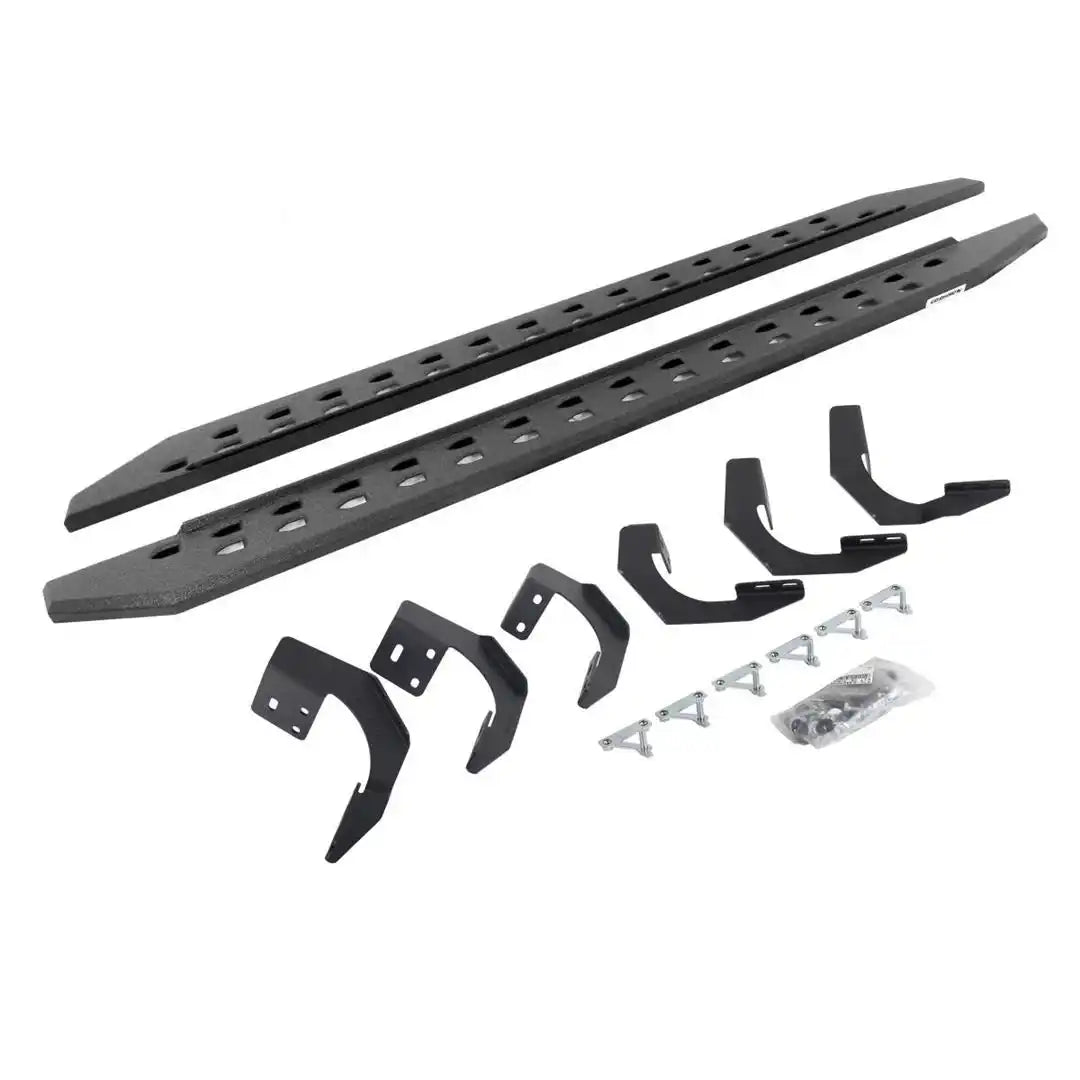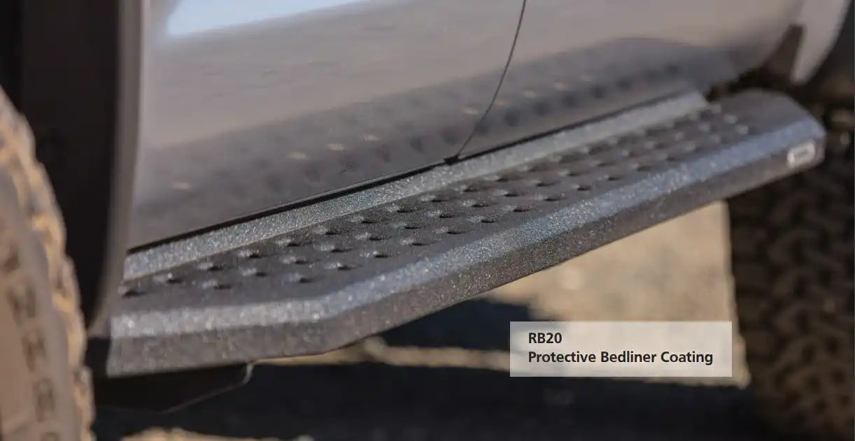 The RB20 Slim Line Running Boards offer the same heavy duty toughness as the original RB Series, but with a slimmer design that fits tighter along the cab for increased ground clearance when off-roading. Constructed from 16-gauge zinc-coated galvanized steel, the Raptor-inspired boards were built to protect your panels from debris while providing a full-length step platform. The modern, bullet-stamped design is 5 1/2 Inch across at its widest point compared with 7 1/2 Inch of the original RB20 and are offered in cab-length sizes that fit most popular trucks, Jeeps and SUVs.