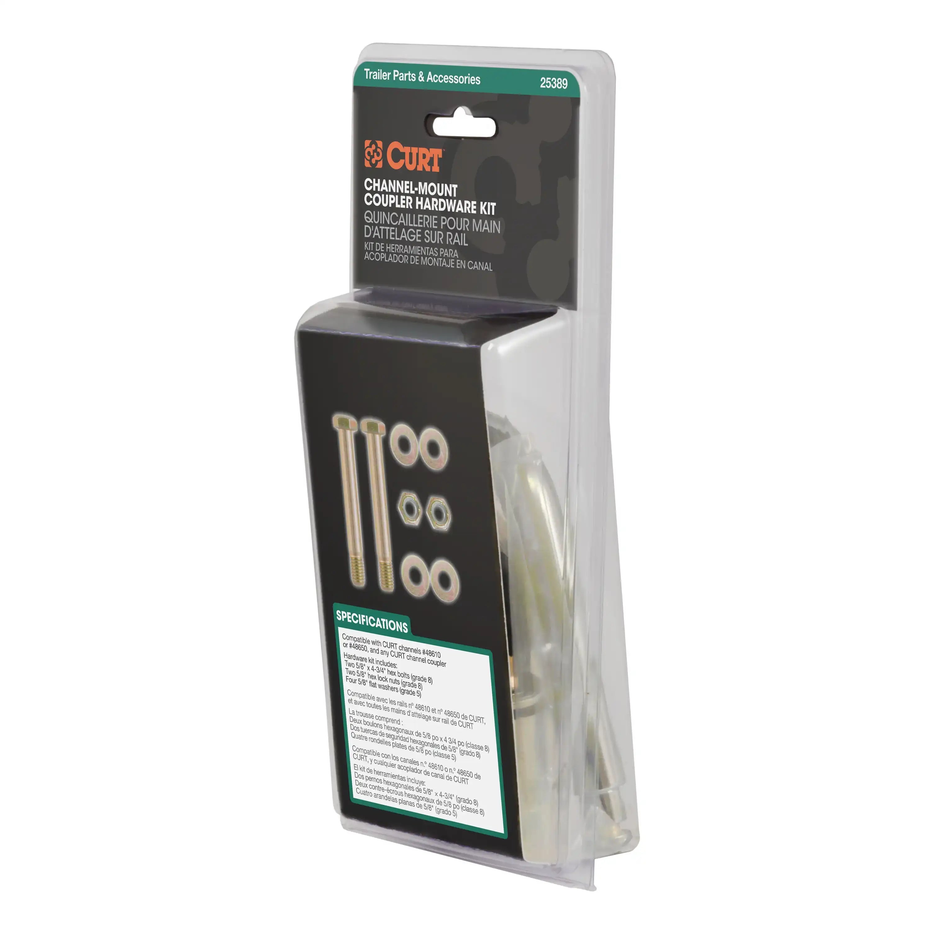 If you are replacing a broken coupler on your trailer or installing a new one on a trailer you are building, CURT has dependable couplers you can trust to keep your tow load latched on tight. Selecting the right trailer hitch, ball mount and trailer ball to manage the weight of your trailer is not the only important aspect of towing; you also need a trailer that can stand up to the road ahead. That means equipping it with a coupler that is built to go the distance. Providing the highest weight capacity and the most flexibility in coupler design, CURT adjustable channel couplers are a unique option for your trailer. This type of coupler does not bolt onto a trailer's frame the same way that a standard coupler does. It uses a pair of bolts to mount onto an adjustable eye channel to allow for easy height adjustment. The two attachment bolts also provide greater stability and less rattle. This replacement channel-mount coupler hardware kit features grade-8 bolts for solid mounting. It includes two 5/8" x 4-3/4" hex bolts, two 5/8" nylock hex nuts and four 5/8" flat washers. It is compatible with CURT channel mounts #48610 and #48650, as well as all CURT channel-style couplers, including #25319, #25328, #25329 and #25330.