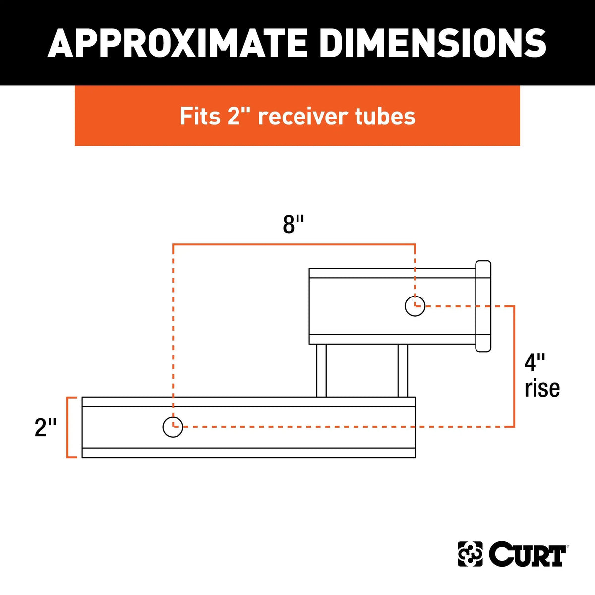 CURT hitch adapters and extenders are easy to use and help provide level towing for your trailer. This receiver hitch adapter is designed to fit a 2-inch x 2-inch receiver tube opening. It not only extends the receiver but also provides 4 inches of drop or 4 inches of rise. It is great for adjusting the height of a ball mount, bike rack or other hitch accessories. It has a max weight capacity of 7,500 lbs. This raised hitch adapter extension is also ideal for dinghy towing, allowing you to level your tow bar with the vehicle base plates. CURT hitch adapters are crafted to be durable and dependable. This drop down hitch adapter features a strong steel construction, precise welding and a durable black powder coat finish for lasting resistance against rust, chipping and UV damage.
