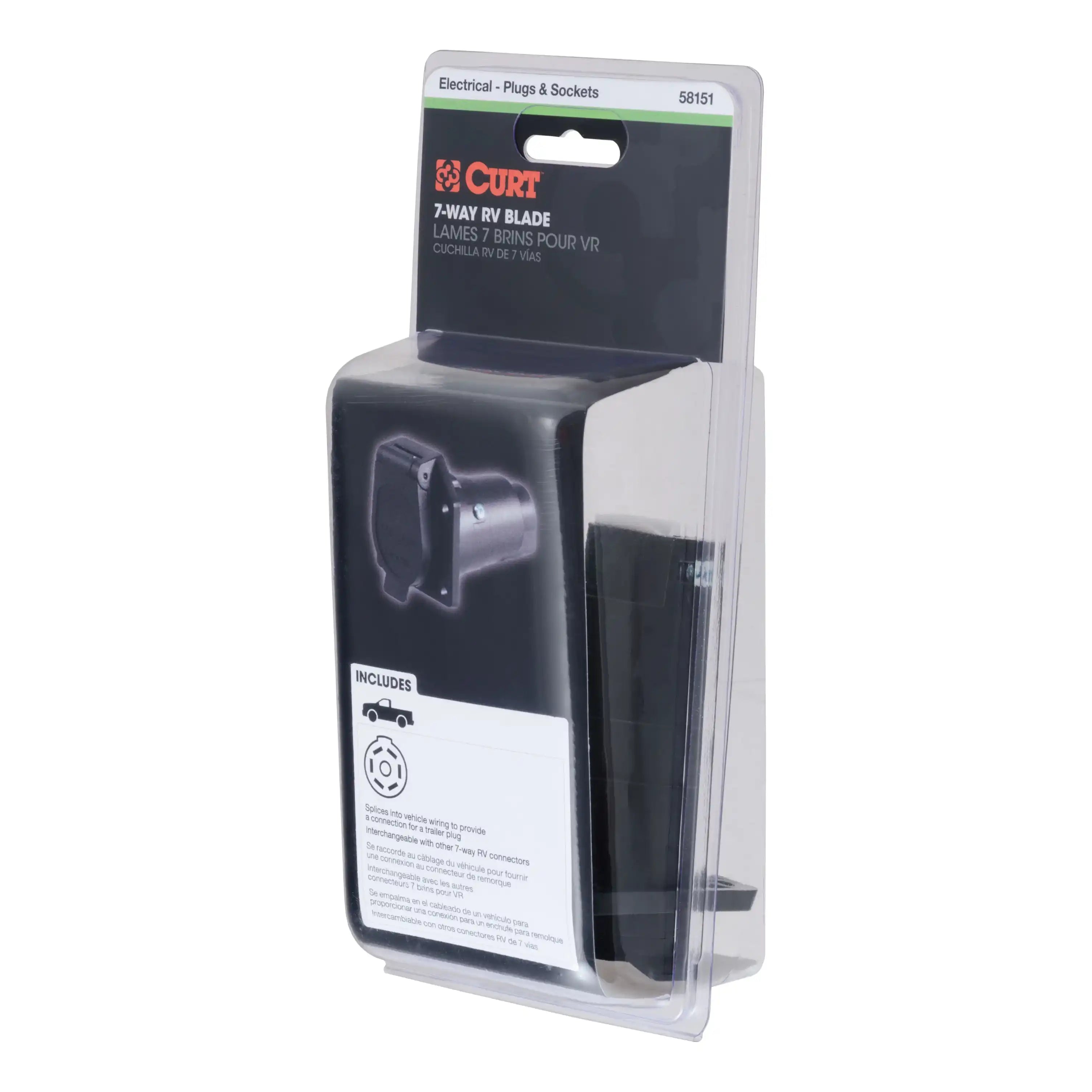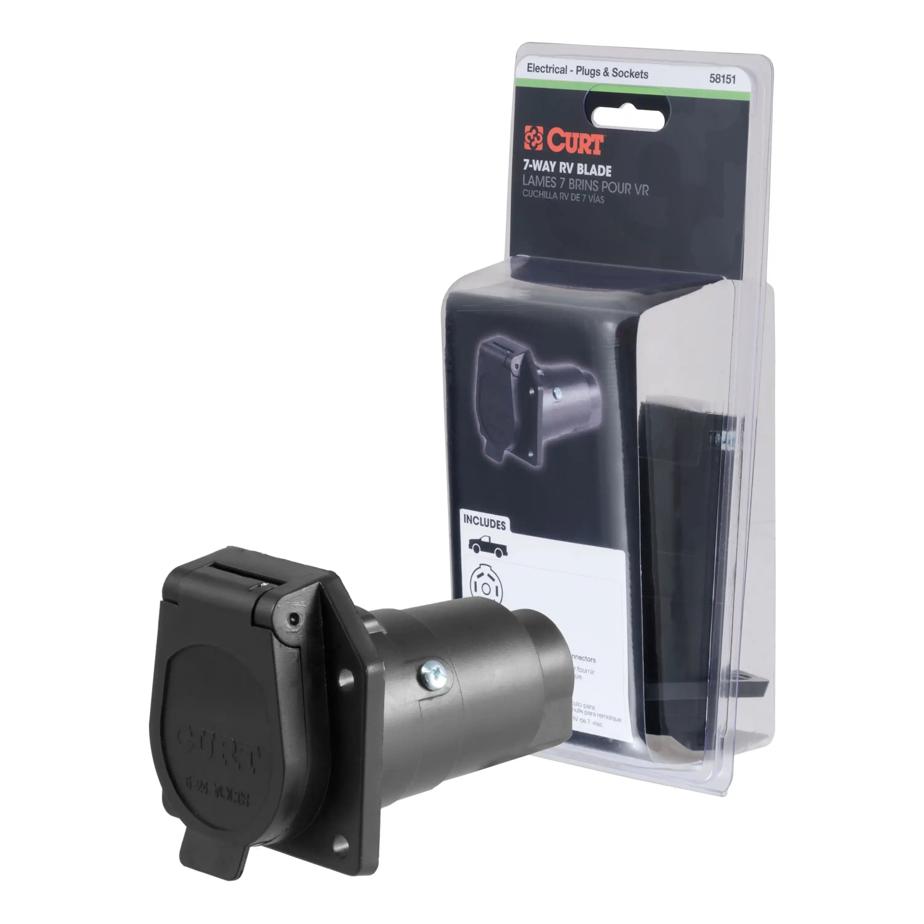 Like trailer hitches and ball mounts, electrical connectors range all over the board in shape, size and capability, but no matter what your trailer's electrical functions are, you need a solid connection to keep the power flowing and ensure safety on the road. CURT electrical connectors are designed and manufactured to give you a reliable connection every time you plug in your trailer. This 7-way round RV blade connector is designed to supply power for tail lights, turn signals, electric trailer brakes, a 12-volt battery, reverse lights and brake lights, as well as a ground connection. It features rust-free black plastic construction and comes with a spring-loaded cover to keep out dust and water. This 7-way round connector is a female-end socket, specifically designed for the vehicle side of the connection. 7-way RV blades are typically used on RV travel trailers, and this particular connector can be easily interchanges with other 7-way RV connectors.