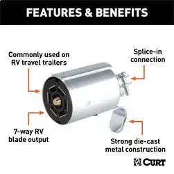 Like trailer hitches and ball mounts, electrical connectors range all over the board in shape, size and capability, but no matter what your trailer's electrical functions are, you need a solid connection to keep the power flowing and ensure safety on the road. CURT electrical connectors are designed and manufactured to give you a reliable connection every time you plug in your trailer. This 7-way round RV blade connector is designed to supply power for tail lights, turn signals, electric trailer brakes, a 12-volt battery, reverse lights and brake lights, as well as a ground connection. It features rust-free black plastic construction and is a male-end plug, specifically designed for the trailer side of the connection. 7-way RV blades are typically used on RV travel trailers, and this particular connector can be easily interchanged with other 7-way RV connectors.