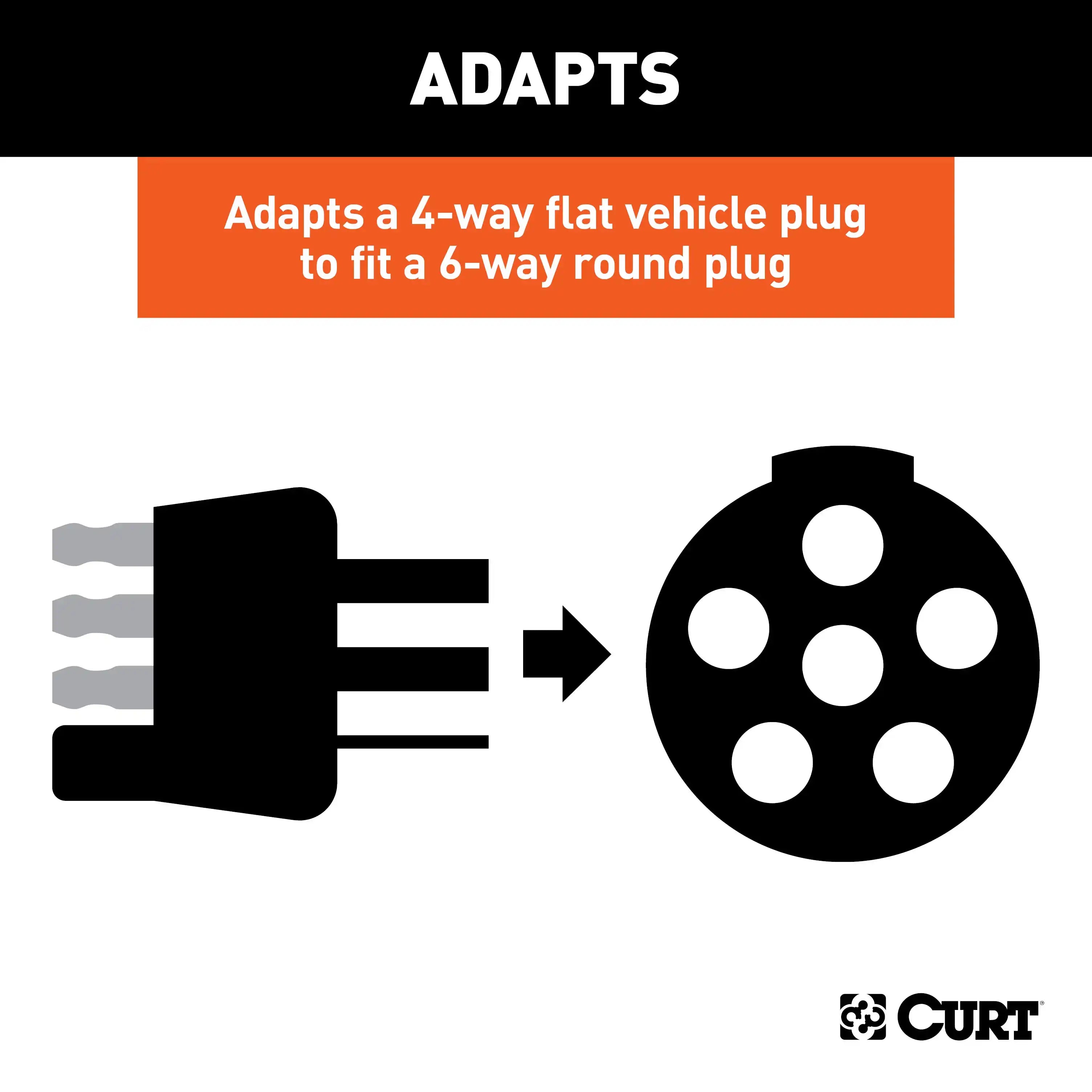 There are several different types of connectors used to supply power from a tow vehicle's electrical system to a trailer's wiring system. Some trailers only need the bare essentials -- running lights, brake lights and turn signals -- while others require a connection for reverse lights, electric brakes and auxiliary power. With connectors ranging from simple to complex, it may be the case that the connection between your vehicle and your trailer is not a perfect match. For example, your truck may be equipped with a 6-way round socket, but your trailer may have a 4-way flat plug. For this very common problem, CURT offers a quick and simple solution in the form of an electrical adapter. An adapter is an electrical device that allows a connection to be made between a mismatched trailer plug and vehicle socket. It easily plugs in your vehicle's electrical socket and usually requires no additional wiring. CURT offers an array of adapters to accommodate most types of plugs and sockets, including 4-way flat, 4-way round, 5-way flat, 6-way round, 7-way RV blades and more. This electrical adapter is designed to adapt a CURT RV harness with 4-way flat output to fit a 6-way round. It is particularly intended for use in flat towing and dinghy towing to equip the dinghy vehicle with a 6-way round connector. It plugs in under the hood of the towed vehicle and allows for flexible mouting vs. traditional welded connector brackets. It is constructed from quality plastic and requires some splicing. All CURT wiring and electrical products come with a one-year limited warranty to give you the assurance you need to tow with confidence.
