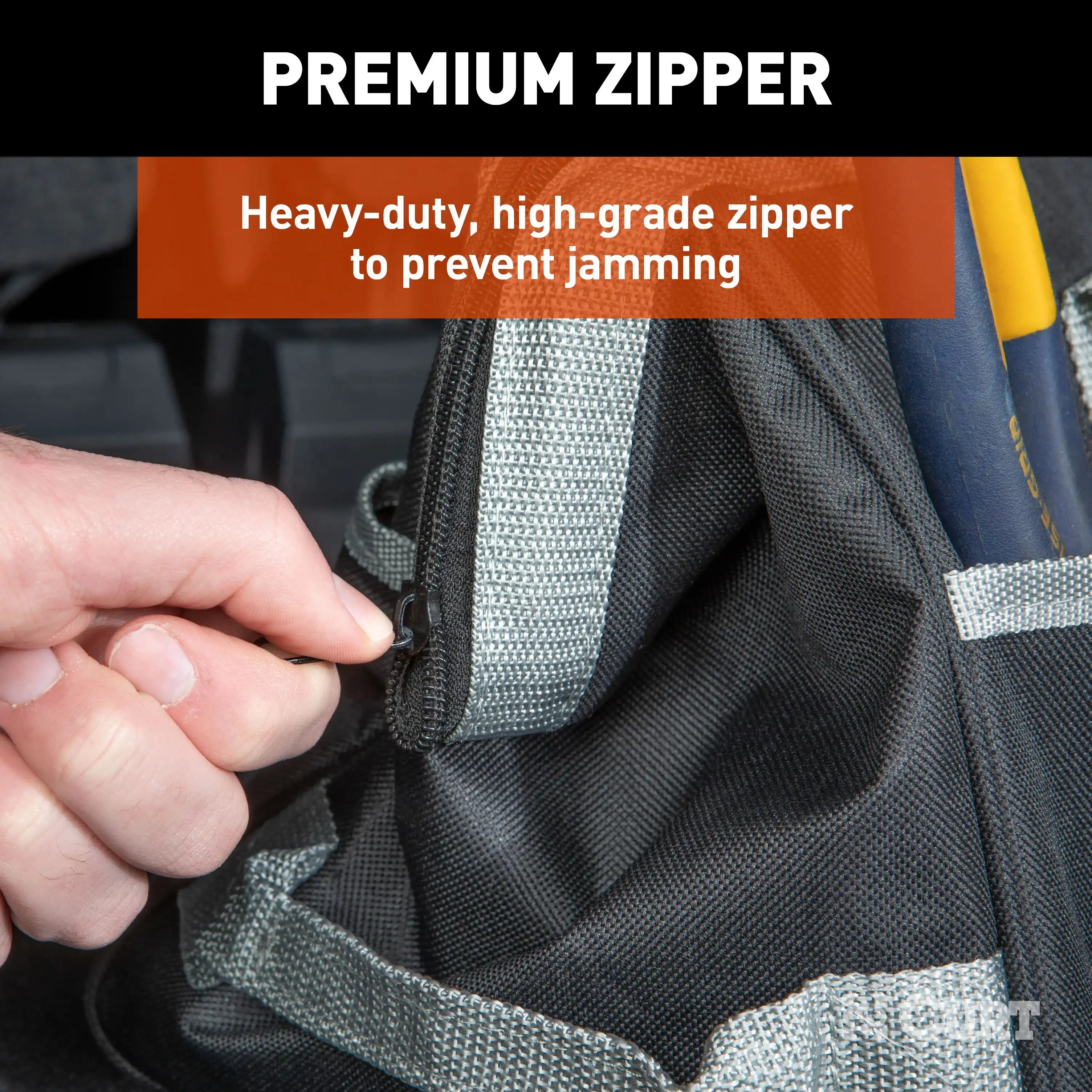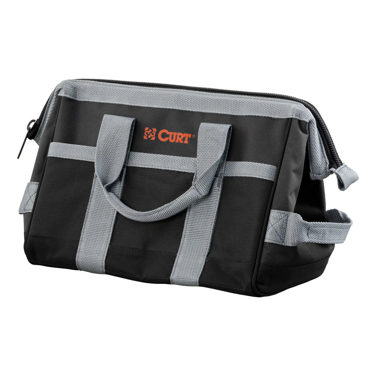 This CURT tool bag is the perfect way to store your towing accessories in your vehicle. Rather than throwing them haphazardly in the trunk or truck bed, this storage bag allows you to keep all of your equipment organized and on-hand, ready to use. It's the ideal towing accessory bag, providing reliable storage for a ball mount, trailer ball, hitch lock, adapters, cables and more. It is also perfect for storing flat towing equipment, such as a tow bar, attachment tabs and locks. The CURT towing accessories bag is constructed from tough fabric and reinforced with straps to hold heavy tools. It comes with 14 pockets for great organization and features a metal lining to keep the opening propped open while you work. For ergonomic portability, this storage bag also features comfort-grip handles.