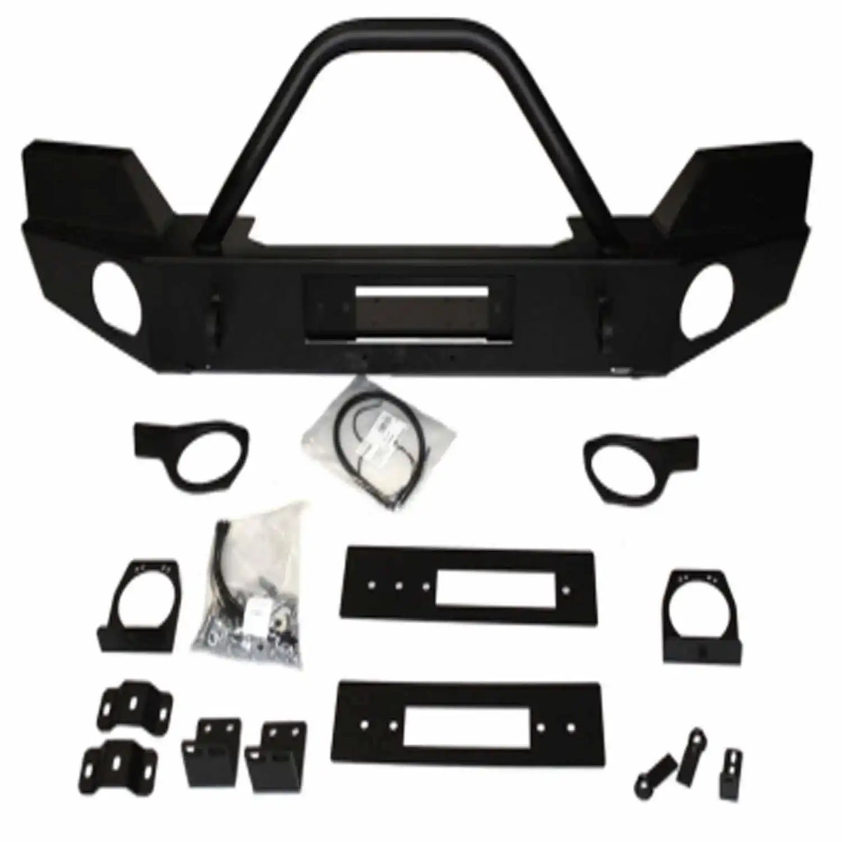 One Piece Design; Direct-Fit; Mounting Hardware Included; With Grille Guard; With Internal Winch Mount; Without Tow Hook Mounts/ With D-Ring Mounts; With Light Cutouts; Powder Coated Black Steel
