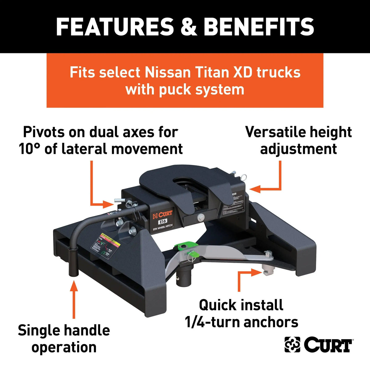 The CURT E16 5th wheel trailer hitch is an economical choice that offers a variety of features for smooth, safe 5th wheel towing. The E16 has a gross trailer weight rating of 16,000 lbs. and can withstand a vertical load up to 4,000 lbs. It comes with a dual-pivoting head, 10 degrees of lateral movement and an anti-rattle skid plate to provide a smoother, quieter ride. The E16 also comes with easy, single-handle operation and a durable carbide black powder coat for long-lasting protection against the elements. With four height adjustment settings, the E16 is quick and simple to install, and it is backed by a limited lifetime warranty. This 16K 5th wheel hitch comes with a set of CURT OEM puck system 5th wheel legs, designed to be mounted on a Nissan Titan XD long-bed pickup with the truck bed puck system. Using a set of quarter-turn anchors, the legs quickly and easily drop into the pucks, instantly mounting the E16 hitch and equipping the truck for 5th wheel towing. The anchors feature an adjustable design to perfectly lock the hitch into place and eliminate any chucking noises, and the legs are finished in a durable carbide black powder coat to be highly resistant to scratches, rust and UV damage. These legs are only intended to fit the Nissan puck system and cannot be installed without it.