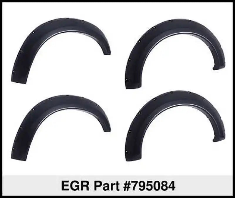 EGR Bolt On Look Fender Flares features EGR's OEM grade, no drill installation. EGR Fender Flares are the perfect DIY upgrade for your vehicle. The UV protected, lightly textured finish is easy to clean and fade resistant. EGR Fender Flares can also be easily painted to match your vehicle. Real stainless steel bolts for uncompromising detail. Increase tire coverage of your fenders by up to 2 inches. Limited lifetime warranty. FRONT & REAR SET.
