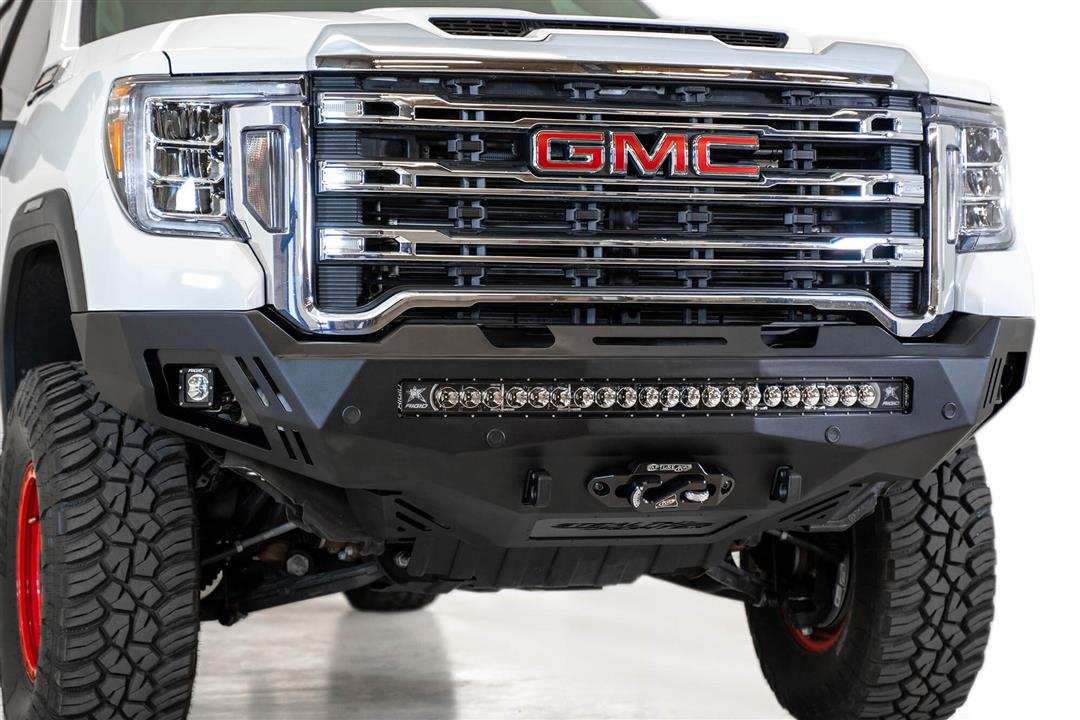 | Description_MKT | Addictive Desert Designs has done it again! Stealth Fighter Bumpers are now available for all GMC 2500/3500 models. With precision engineering, our radius steel plate design contours perfectly to the front end of your truck. A universal light mount, centered on the bumper, provides space for up to 10 cube lights or a 40" radius light bar. Standard cutouts allow OEM parking sensors to be fully-retained and side panels come with an additional cube light. For added strength, Stealth Fighter's bolt directly to the truck's frame with a standard winch mount. Functionality and durability are maximized with access holes at the top of the bumper. Clevis mounts provide added reinforcement with a mounting point for 3/4" D-rings. Always bolt-on, always made in America. |