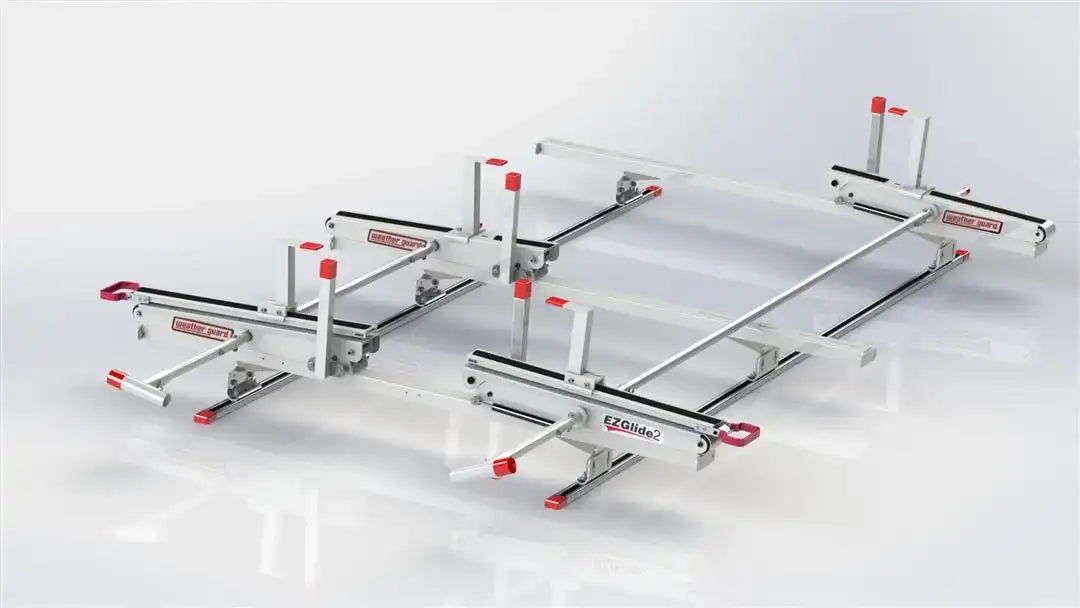 The EZ Glide 2™ van rack, designed to make getting ladders on and off your van easy, is one of the lightest, safest drop-down ladder rack systems available for mid and high-roof vans. The slide down system extends the ladder for an extra two feet after the drop-down rotation. The EZ Glide 2™ drop-down van roof rack comes with a single-side drop-down system that you can mount on either the passenger or the driver side. Convert to a dual drop-down van rack with a dual drop-down kit for long or short ladders. Use this ladder rack for vans with the mounting channel kit designed for your van.