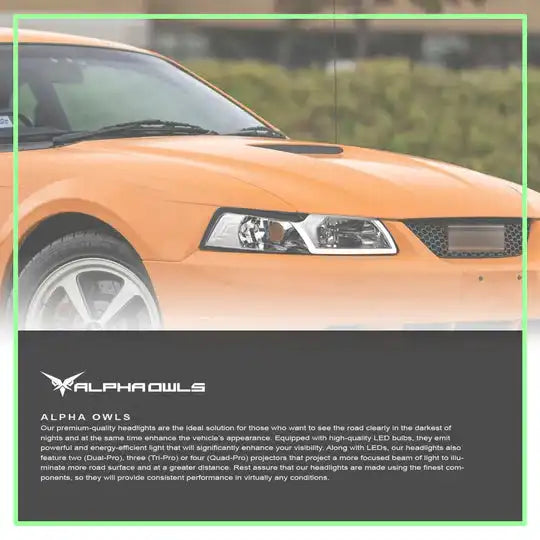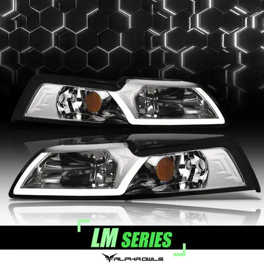 Alpha Owls 1999-2004 Ford Mustang LM Series Headlights (Crystal Headlights Chrome housing w/ LumenX Light Bar).