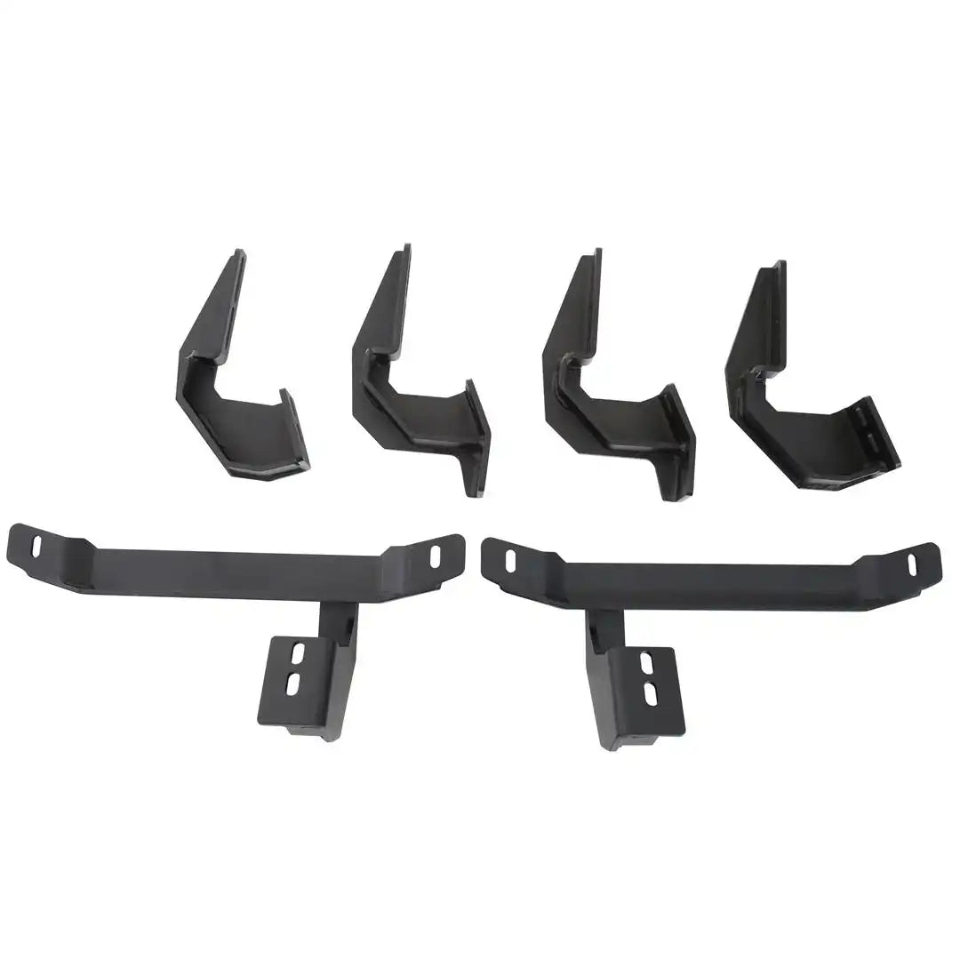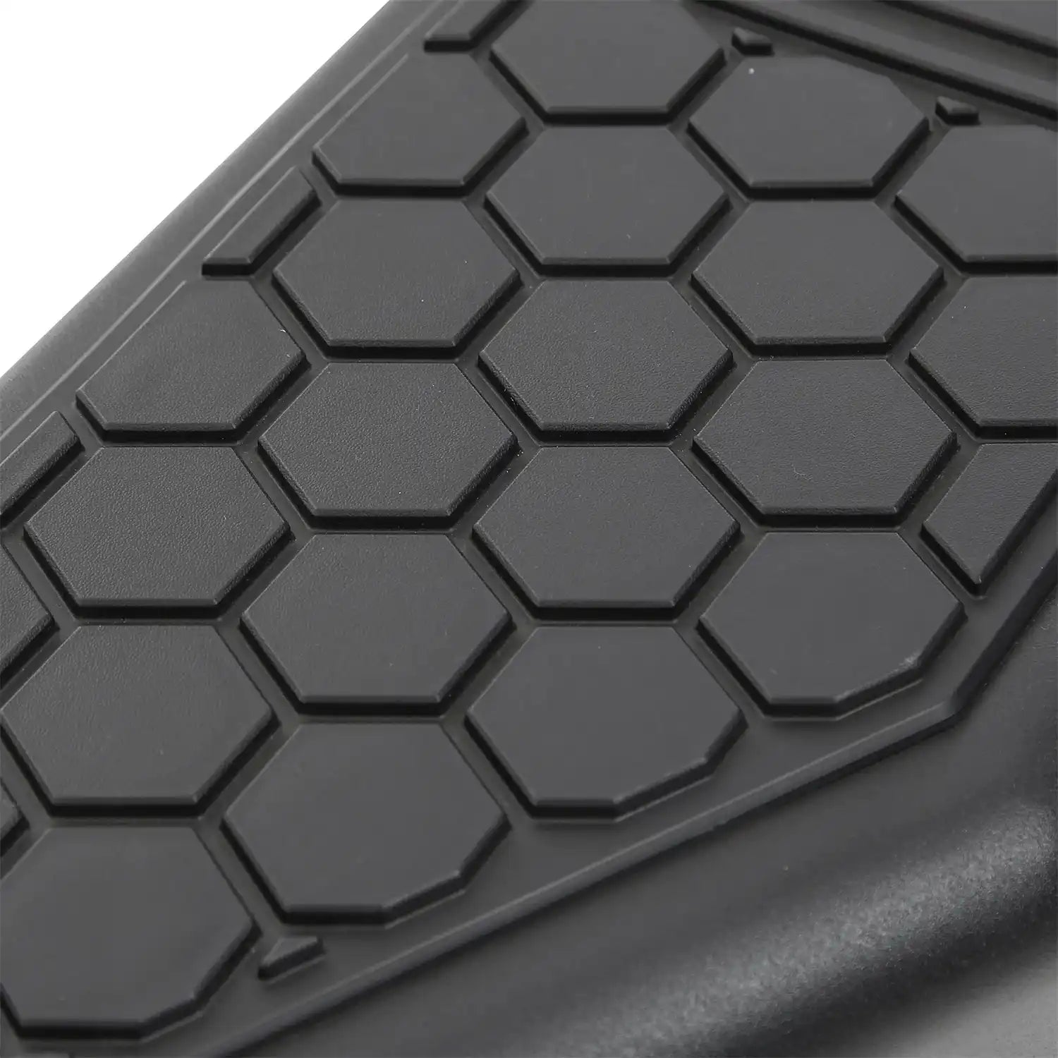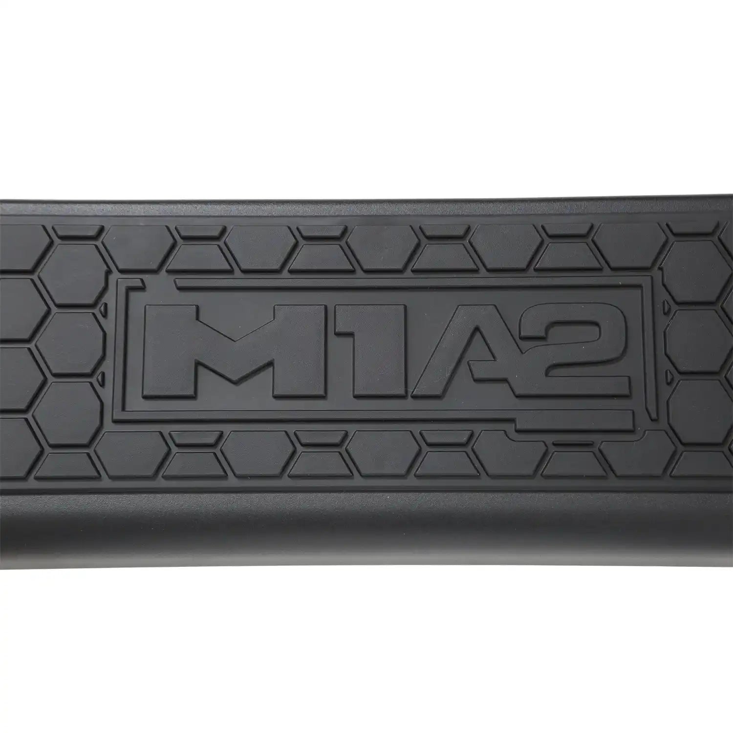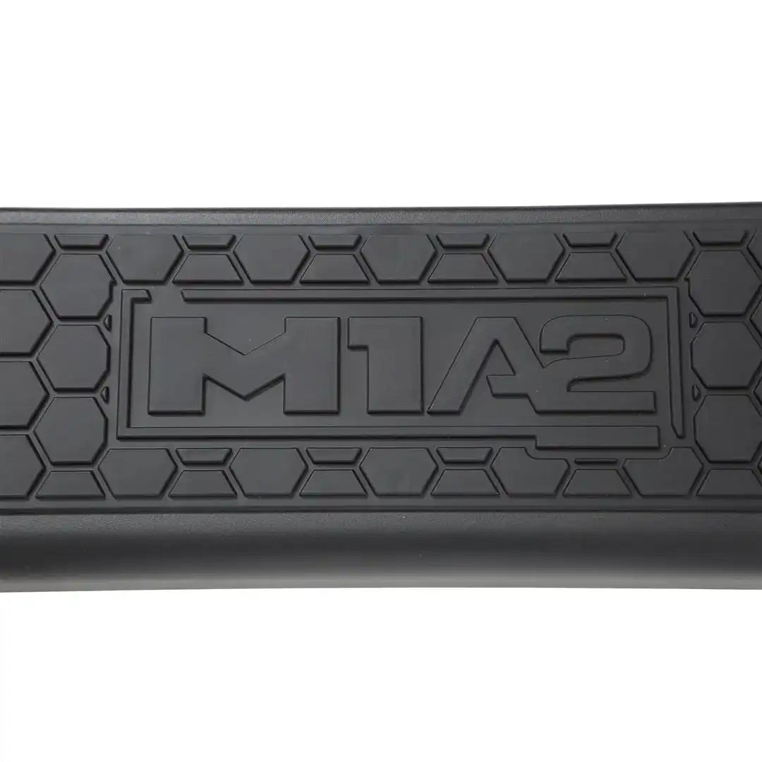 The M1A2 family is completed with the matching side steps, with large radius bends that match the bumpers. The steps mount high and tight for optimal clearance and the .188" thick mounting brackets ensure a strong, rigid hold with minimal movement. The bolt-on step plate has a unique hexagonal pattern mirroring the bumpers’ mesh panels and the distinctive M1A2 logo illuminates whenever your door opens.Â