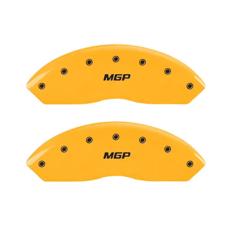 Set of 4 caliper covers, Engraved Front and Rear: MGP, Yellow powder coat finish, black characters.