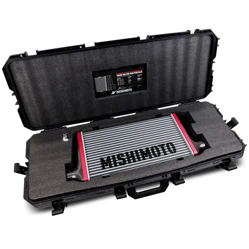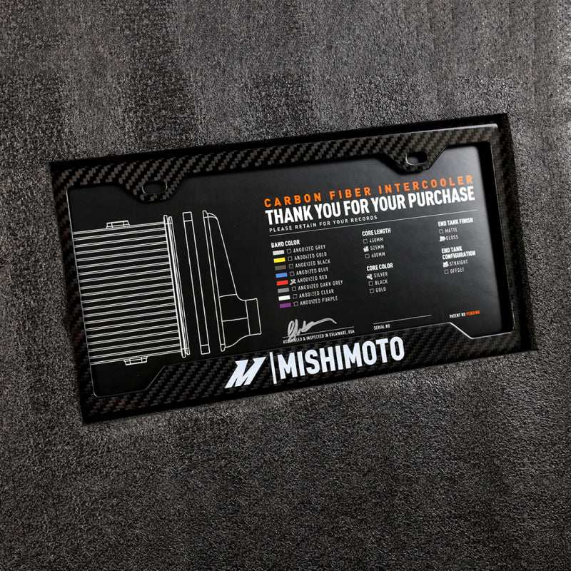 except precisely woven carbon fiber in your choice of matte or gloss finish, paired with eight different anodized V-band clamp colors, and three core colors. Over 280 combinations of colors and configurations mean the Mishimoto carbon fiber intercooler will fit any build and look good doing it. Universal M8 mounting bosses on either side of the core make mounting easy. Each Mishimoto Carbon Fiber Intercooler is hand built to order in our Wilmington, DE facility and, like all our products, they're backed by our Mishimoto Lifetime Warranty for a lifetime of uncompromising performance.