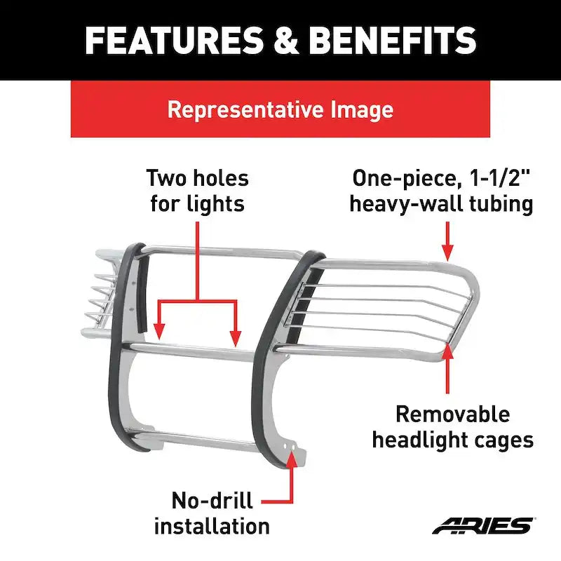For the conqueror in every truck owner, the ARIES grille guard offers the tough, trail-ready look you demand. It features a strong, one-piece build and a vehicle-specific design to perfectly mount on your vehicle with no drilling required. It features custom-bent headlight brush guards to contour to the front end and add protection. ARIES grille guards are also easy to customize with two light mounting holes pre-drilled into the center crossbar for mounting an LED light bar or work lights.