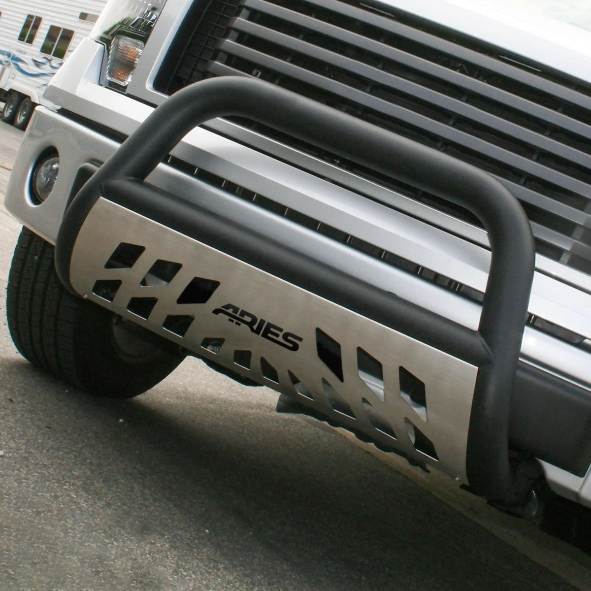 It wasn't the easy road that made you choose your truck. You chose it because there was new territory to be explored, wilderness to be tamed and terrain to be conquered. And if you didn't settle for "good enough" with your truck, why would you settle when it comes to choosing a bull bar? The ARIES Pro Series 3" bull bar is built, finished and tested for the hardworking, off-road-style truck. It is constructed with heavy-wall, 3" diameter tubing of high-strength carbon steel, and it is finished in a dual-layer E-coat and textured black powder coat. This two-part powder coat finish is not only resilient to chipping and peeling, but the textured surface is designed to easily hide minor scratches, grime and whatever else you encounter on the trail. We also put it through a salt spray test to ensure excellent rust resistance in any season. To add functionality and customization options to your truck, the Pro Series bull bar comes with a customizable crossbar and a removable skid plate. The crossbar features two pre-drilled holes to accept round lights up to 5-1/2" in diameter or an LED light bar. The skid plate is constructed from 304 stainless steel and has a brushed finish to hide nicks and scratches from road debris. It also features an aggressive, ARIES-exclusive cutout and a removable design for a customized look on your vehicle. Like all ARIES bull bars, the Pro Series 3" bull bar is made for a vehicle-specific fit and easy, no-drill installation. This bull bar fits select model years of the Toyota Tacoma (see application info to verify fitment).