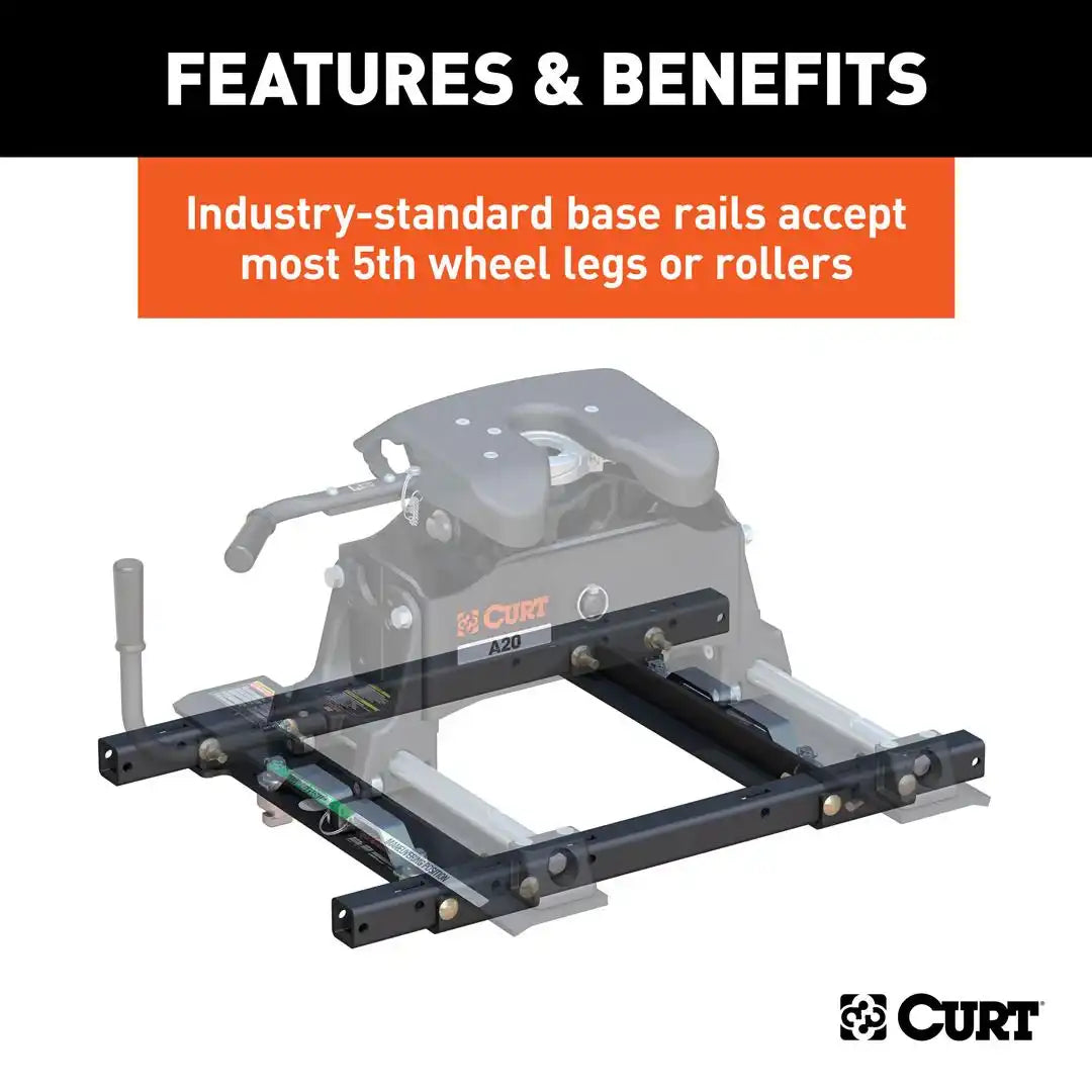 The CURT OEM puck system 5th wheel adapter for Chevy, Ford and GMC pickups combines the functionality of CURT 5th wheel puck system products with the strength and convenience of the truck bed puck system. The adapter provides a set of industry-standard 5th wheel rails to securely mount a CURT 5th wheel hitch or roller into the bed of your truck. It is designed to fit select model years of the Chevrolet Silverado, GMC Sierra 2500 HD and 3500 HD and Ford F-250 and F-350 Super Duty (see application info to verify fitment). It features a set of adjustable, quarter-turn anchors to quickly and easily drop into the pucks and provide a moveable platform for the 5th wheel coupling point. This puck system adapter requires a specific puck system for installation (year range specific). It features a capacity of 25,000 lbs. and is compatible with all CURT 5th wheel legs and rollers (weight capacities are limited to the lowest-rated towing component). Like our other OEM puck system 5th wheel products, the key feature of the 5th wheel puck system adapter is its quarter-turn anchors. With the hitch initially bolted onto the adapter, the adapter can easily be dropped into place whenever needed and secured with the quarter-turn anchors. The anchors can also be adjusted to help eliminate chucking noises between the adapter and under-bed platform while towing. When you are finished towing, simply turn the anchors to remove the entire assembly within seconds. The CURT 5th wheel adapter for select Chevrolet, Ford and GMC pickup trucks provides the ultimate in versatility for the CURT 5th wheel line. It tested for safety in accordance with SAE J2638 and is coated in a highly durable carbide black powder coat finish to protect against scratches and rust.