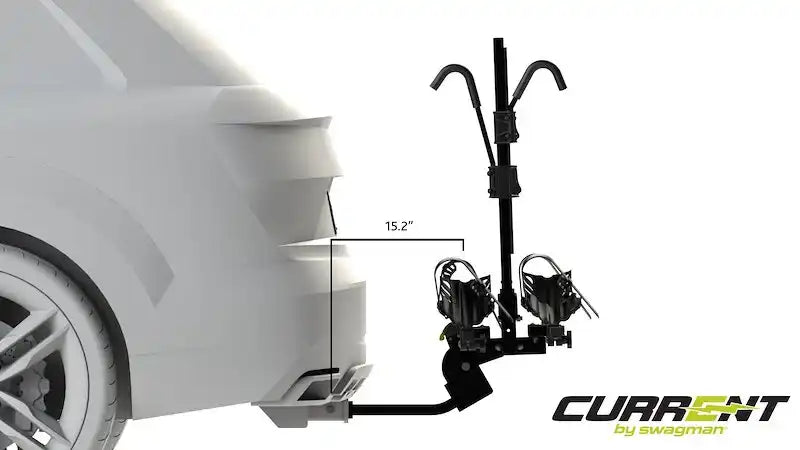 The Swagman CURRENT is a heavy duty rack designed to carry two heavier bikes. It’s a great choice if you have an ebike (or two), with a higher weight capacity of 60lbs per bike. It also comes ready to fit your fat tire bikes up to 5” wide. The locking ratchet hooks and locking threaded hitch pin keep your bikes and rack secured to your vehicle. The rack tilts back so you can access your trunk without taking the bikes off and folds up out of the way when not in use.