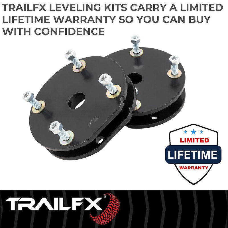Engineered for durability and reliable performance, without sacrificing ride quality. TrailFX leveling kits allow you to level or slightly lift your vehicle for improved stance or additional tire clearance. Kits come complete with spacers and installation hardware and no drilling or cutting is required. Buy confidently with a limited lifetime warranty.