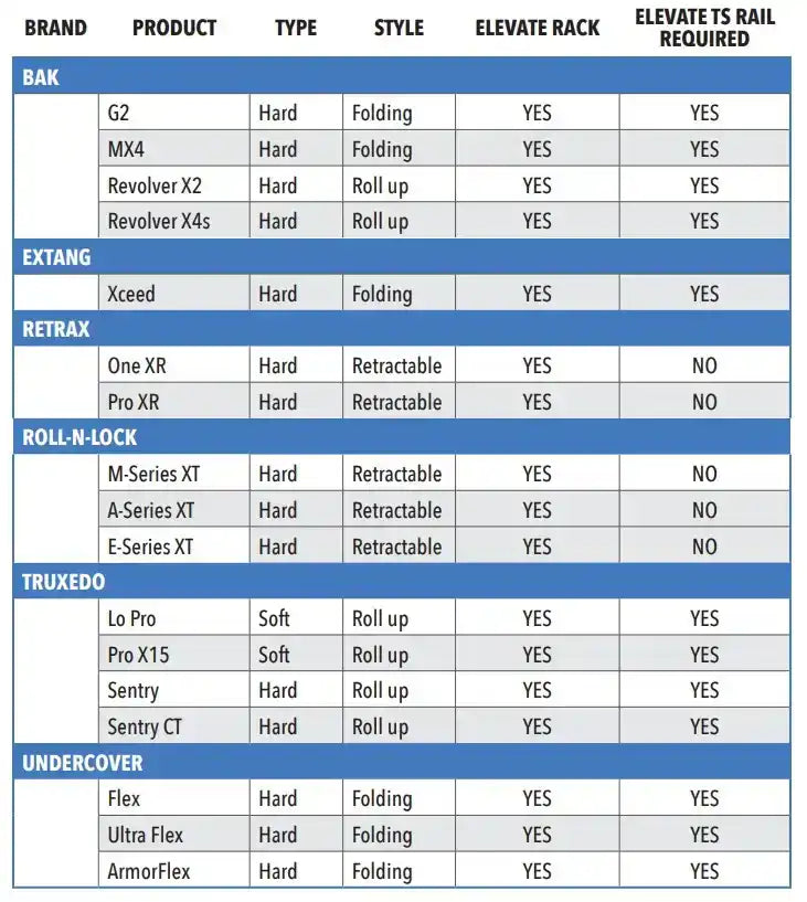 Installation is a breeze — no drilling required. The system works seamlessly with most inside-mount tonneau covers, and when paired with Elevate TS Rails (sold separately), it unlocks full compatibility and modular customization.