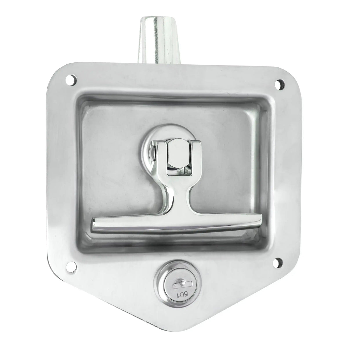 | Description_SLA | This folding T-handle is designed to be a replacement for any UWS topside or underbody tool box. It features a key-operated lock for added box security, and the T-handle itself can be folded in when not in use to eliminate obstructions. The handle and assembly are constructed from polished stainless steel for excellent corrosion resistance. Some rivet installation is required. One handle is included per package. |
